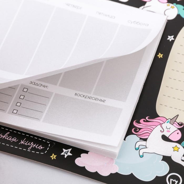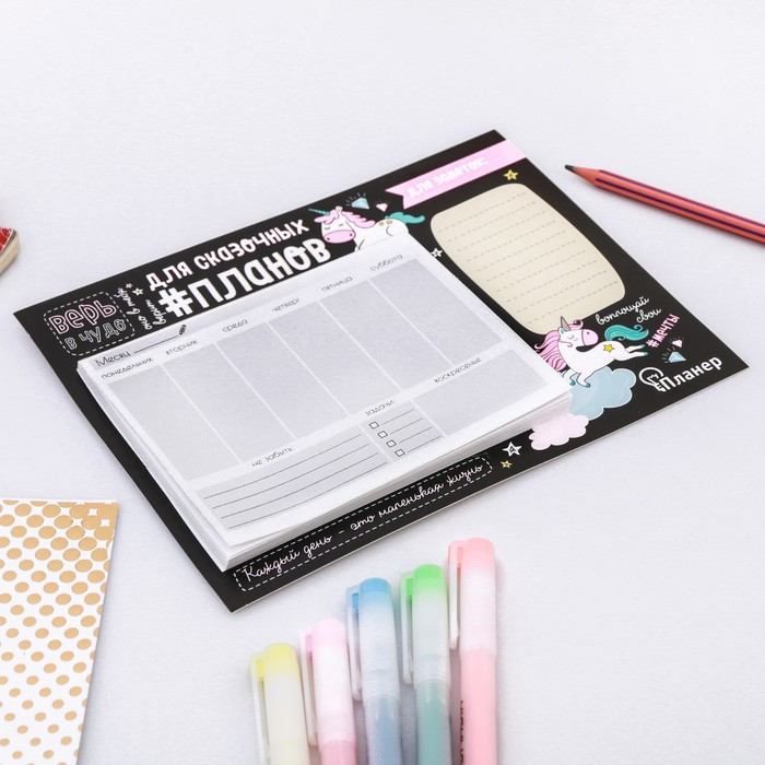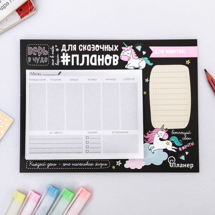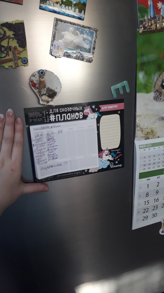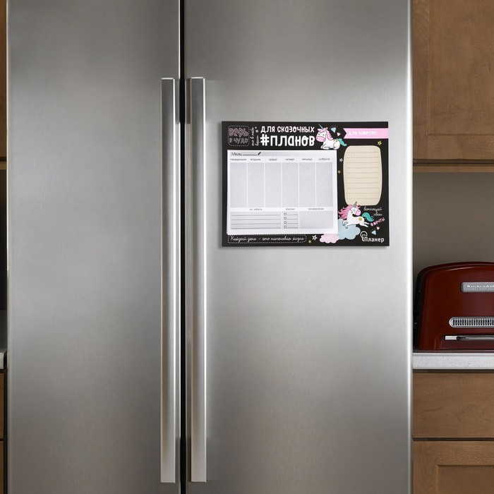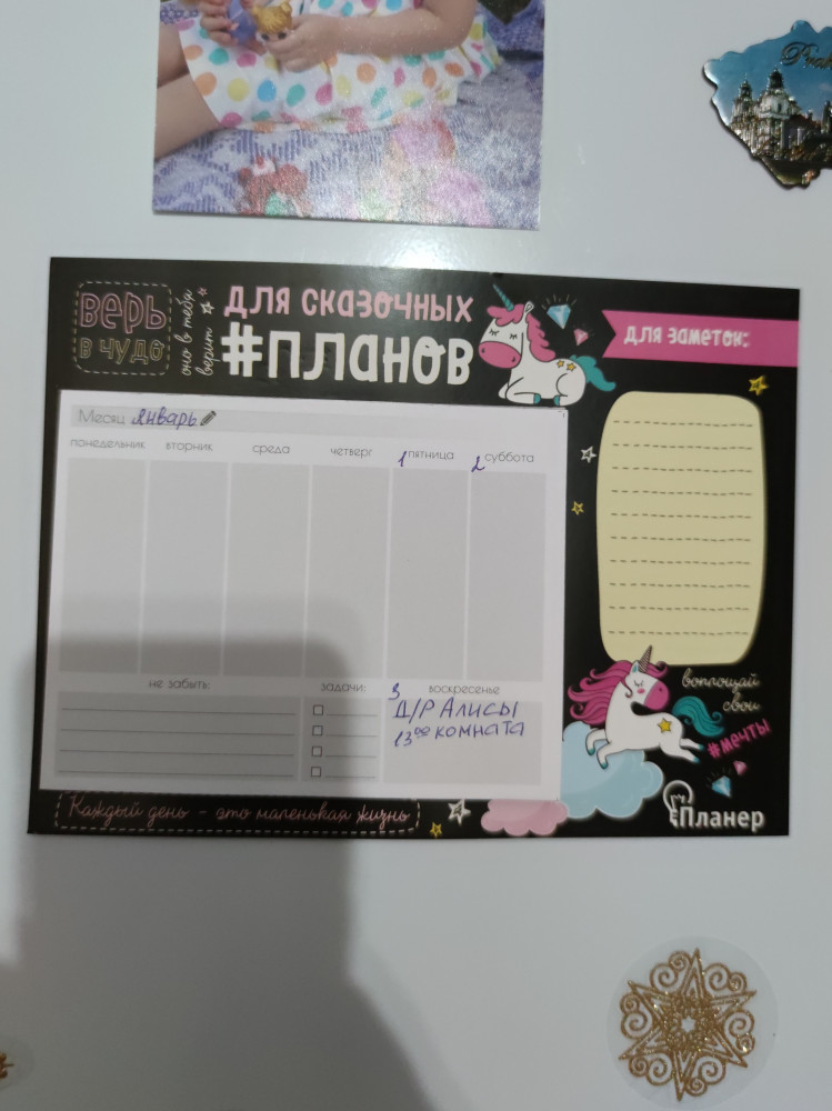 Планер красивый, красочный и компактный. Хорошо держится на холодильнике. Можно написать план на всю неделю сразу. Спасибо Flip за отличный сервис и быструю доставку!