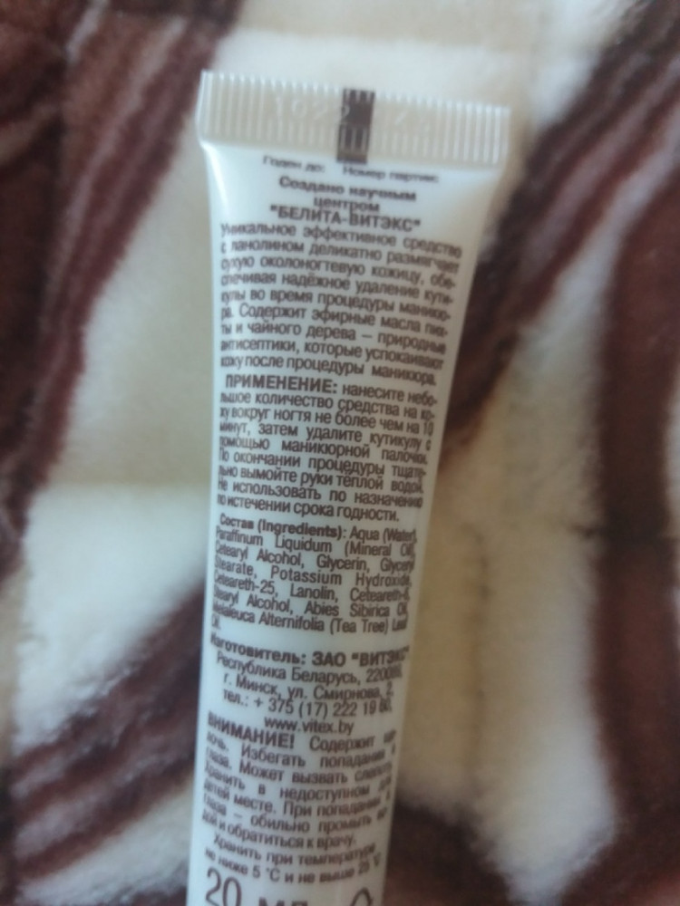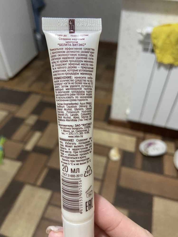 Средство хорошее, функцию свою выполняет. Перед использованием обязательно внимательно ознакомьтесь со способом применения и прочей информацией на тюбике. Производитель пишет, что держать на пальцах средство нужно не более 10-ти минут! Мне обычно хватает 5-6 минут, чтобы всё размякло и оставшихся 3-4 минуты, чтобы удалить кутикулу триммером. Обратите внимание на важное предупреждение производителя (фото внизу). Поэтому во время использования нужно не трогать руками глаза, а после использования тщательно смыть с мылом с рук остатки средства.