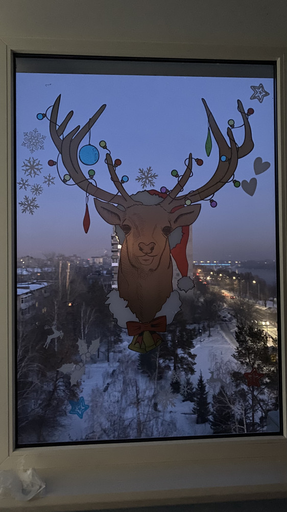 Классная наклейка! Смотрится очень интересно. Но я немного помучилась в процессе наклеивания)) Нет инструкции, пришлось полазить по интернету, но там именно по большому изделию, да ещё с виеватыми рожками, не нашлось подходящего ролика...) Пришлось самой придумывать процесс... Результат - как-то справилась и результат порадовал) Гостям и внуку очень понравилась картинка на окне!)