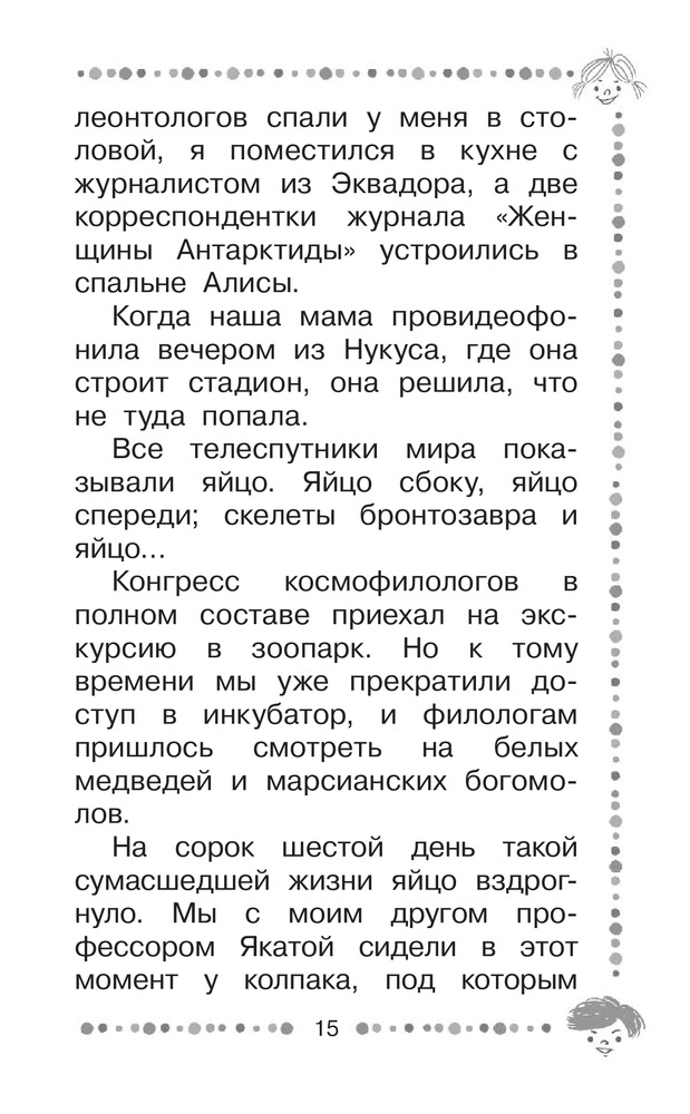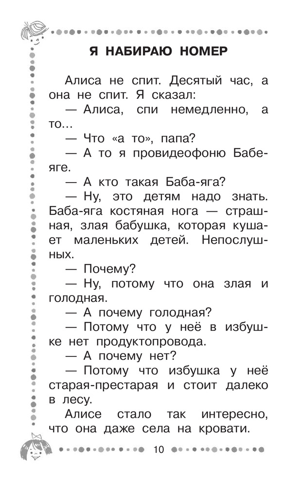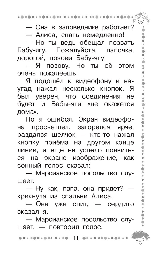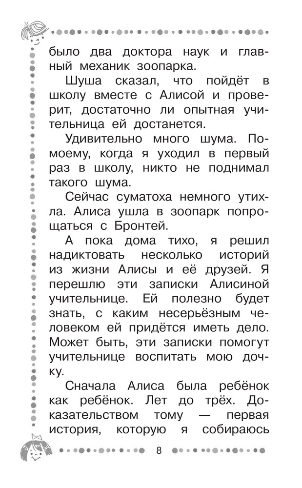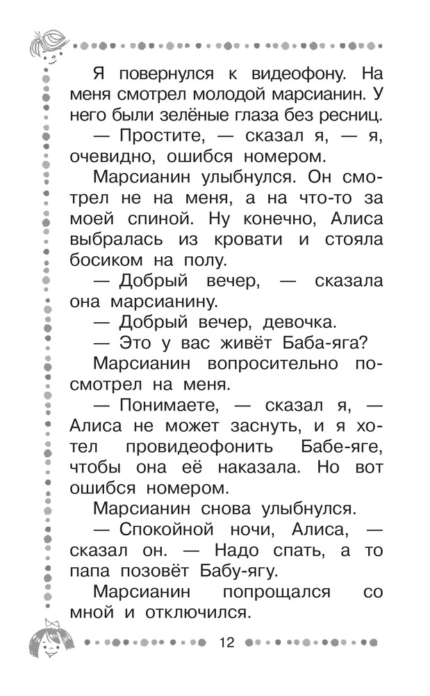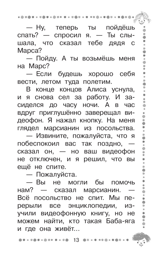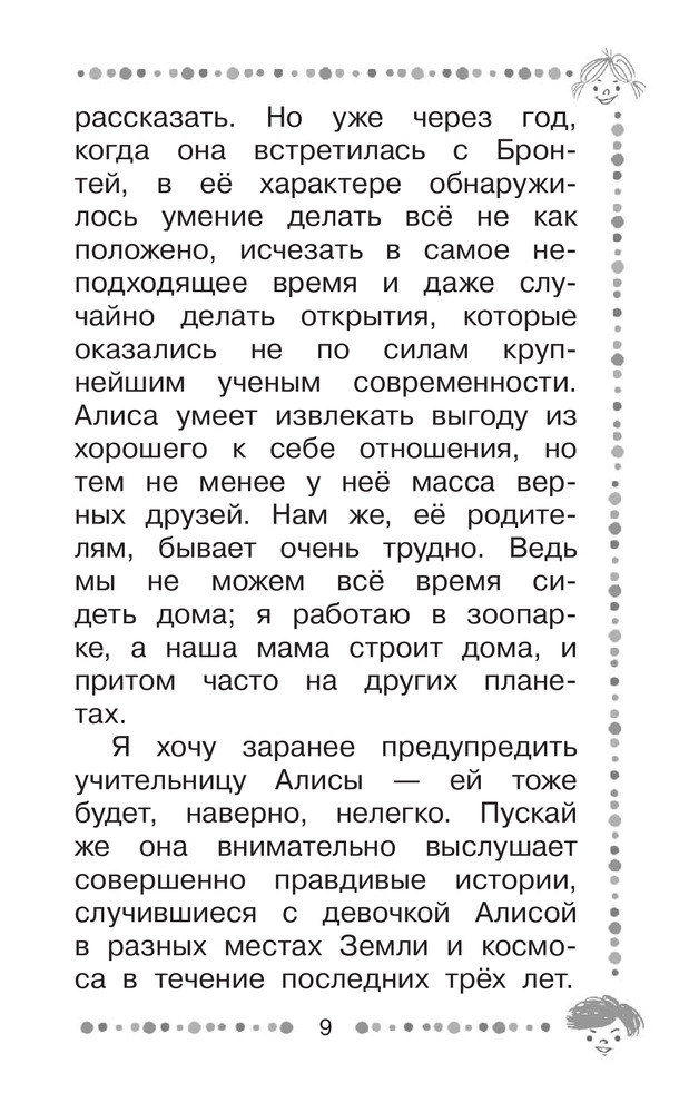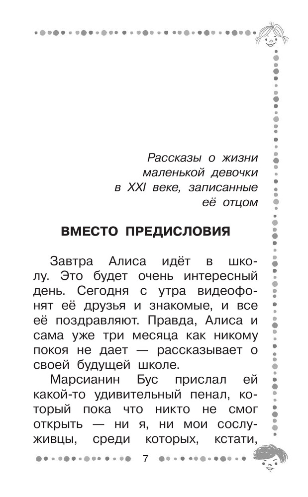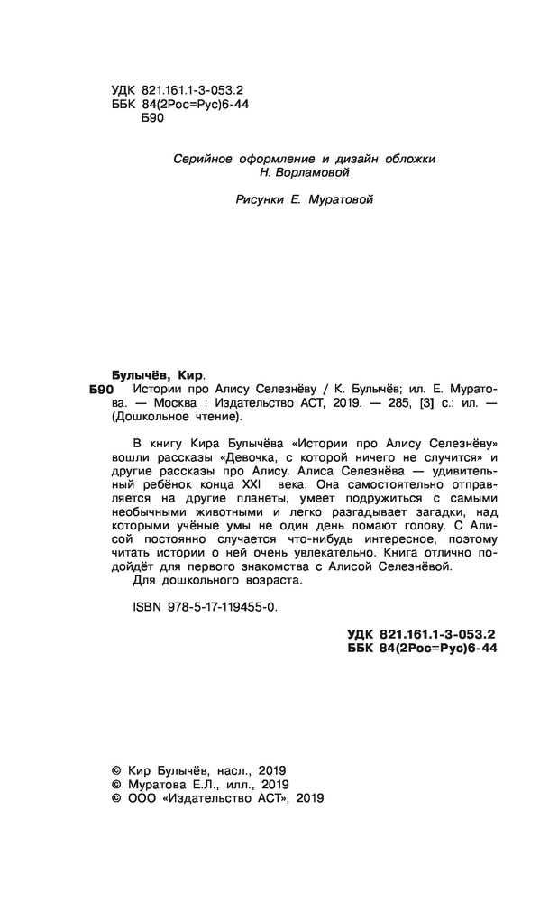 Серия: Дошкольное чтение В книгу Кира Булычёва «Истории про Алису Селезнёву» вошли рассказы «Девочка, с которой ничего не случится» и другие рассказы про Алису. Алиса Селезнёва — удивительный ребёнок конца XXI века. Она самостоятельно отправляется на другие планеты, умеет подружиться с самыми необычными животными и легко разгадывает загадки, над которыми учёные умы не один день ломают голову. С Алисой постоянно случается что-нибудь интересное, поэтому читать истории о ней очень увлекательно. Книга отлично подойдёт для первого знакомства с Алисой Селезнёвой. Для дошкольного возраста. |