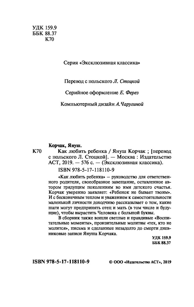 💳 Оплатить за товар можно при получении 🇰🇿 Есть бесплатная доставка по Казахстану 🎁 Копите бонусы с каждой покупки Серия: Эксклюзивная классика «Как любить ребенка» — руководство для ответственного родителя, своеобразное завещание, оставленное автором грядущим поколениям во имя детского счастья. Корчак уверенно заявляет: «Ребенок не бывает твоим». И с бесконечным теплом и уважением к самостоятельности маленькой личности доходчиво рассказывает о том, какие шаги могут предпринять отец и мать (в том числе и будущие), чтобы вырастить Человека с большой буквы. В сборник также вошли светлые и правдивые «Воспитательные моменты», пронзительные молитвы «тех, кто не молится», письма и сделанные незадолго до смерти дневниковые записи Януша Корчака. |