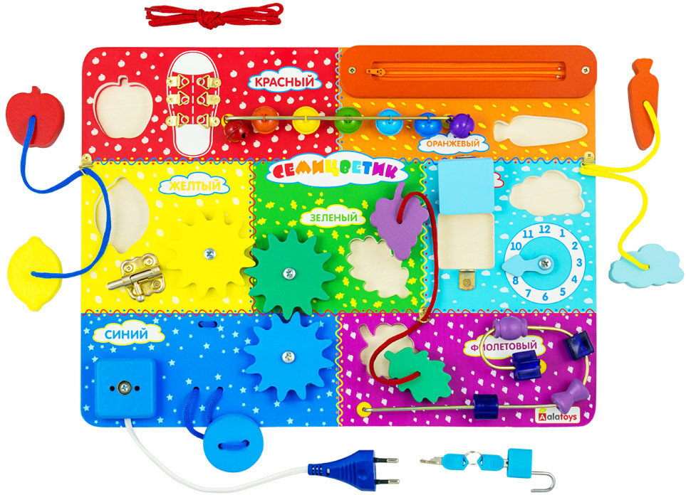 Alatoys Бизиборд «Семицветик»В данный момент этот товар отсутствует в продаже. Возможно, у нас найдется аналогичный или похожий товар здесь. Бизиборд Семицветик идеально подойдет для самостоятельной игры ребенка или для совместной игры и развивающего занятия со взрослым. Помимо развития мелкой моторики, логического мышления и воображения можно заняться развитием речи ребенка.Функционал бизиборд доски:7 игровых полей цветов радугипазлы на шнуркешнуровка на ботинкезастежка-молнияразноцветные колокольчикизамок-щеколдадверца с ключикомциферблат часоврозетка с вилкойпуговица на резиночке шестеренкибусы на лабиринте. |