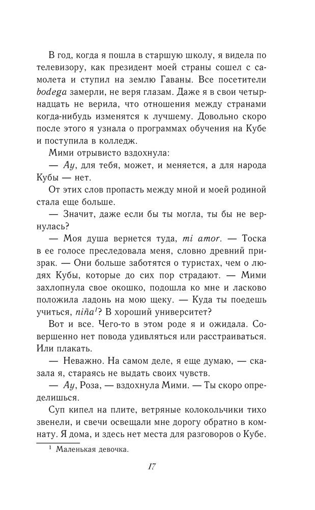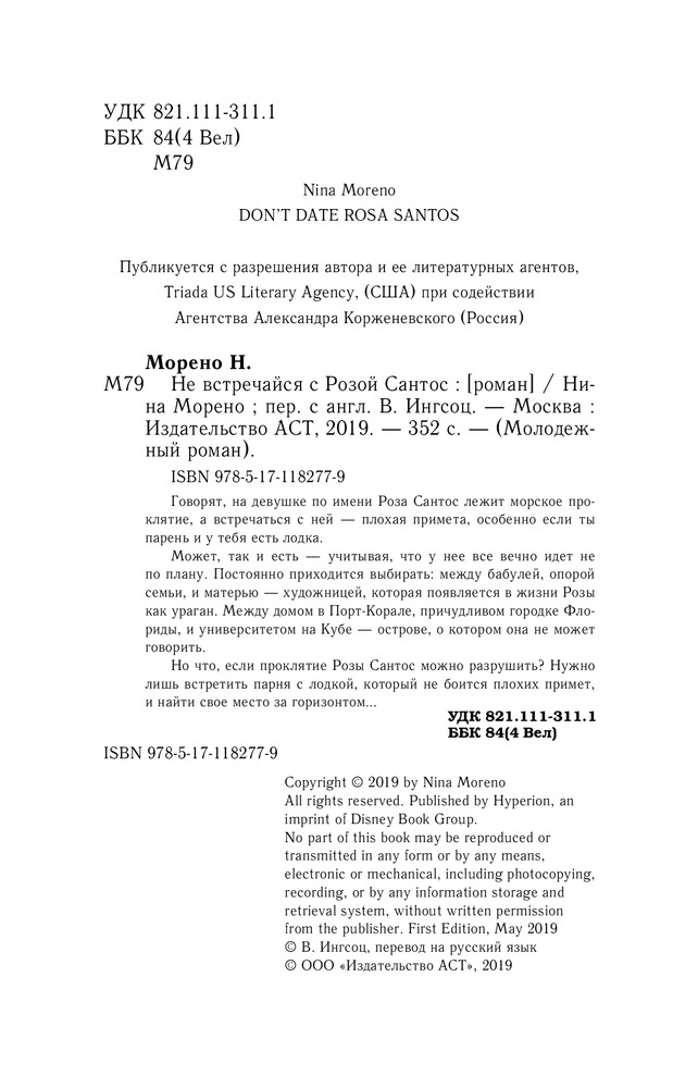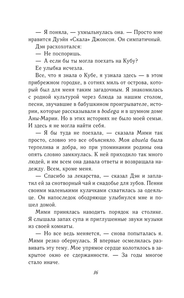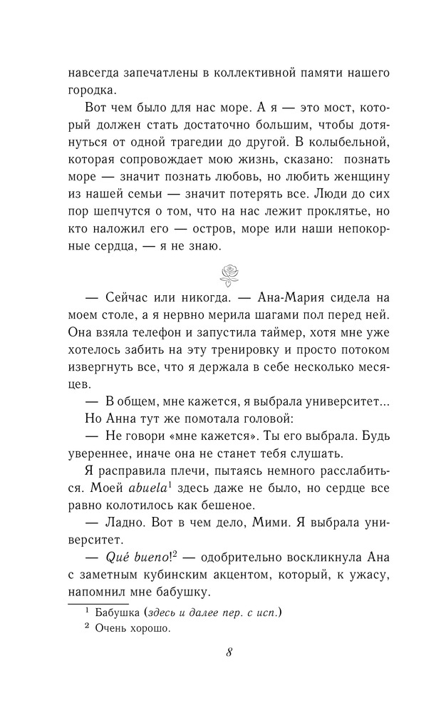 💳 Оплатить за товар можно при получении 🇰🇿 Есть бесплатная доставка по Казахстану 🎁 Копите бонусы с каждой покупки Серия: Молодежный роман Говорят, на девушке по имени Роза Сантос лежит морское проклятие, а встречаться с ней — плохая примета, особенно если ты парень и у тебя есть лодка. Может, так и есть — учитывая, что у нее все вечно идет не по плану. Постоянно приходится выбирать: между бабулей, опорой семьи, и матерью — художницей, которая появляется в жизни Розы как ураган. Между домом в Порт-Корале, причудливом городке Флориды, и университетом на Кубе — острове, о котором она не может говорить. Но что, если проклятие Розы Сантос можно разрушить? Нужно лишь встретить парня с лодкой, который не боится плохих примет, и найти свое место за горизонтом... |
