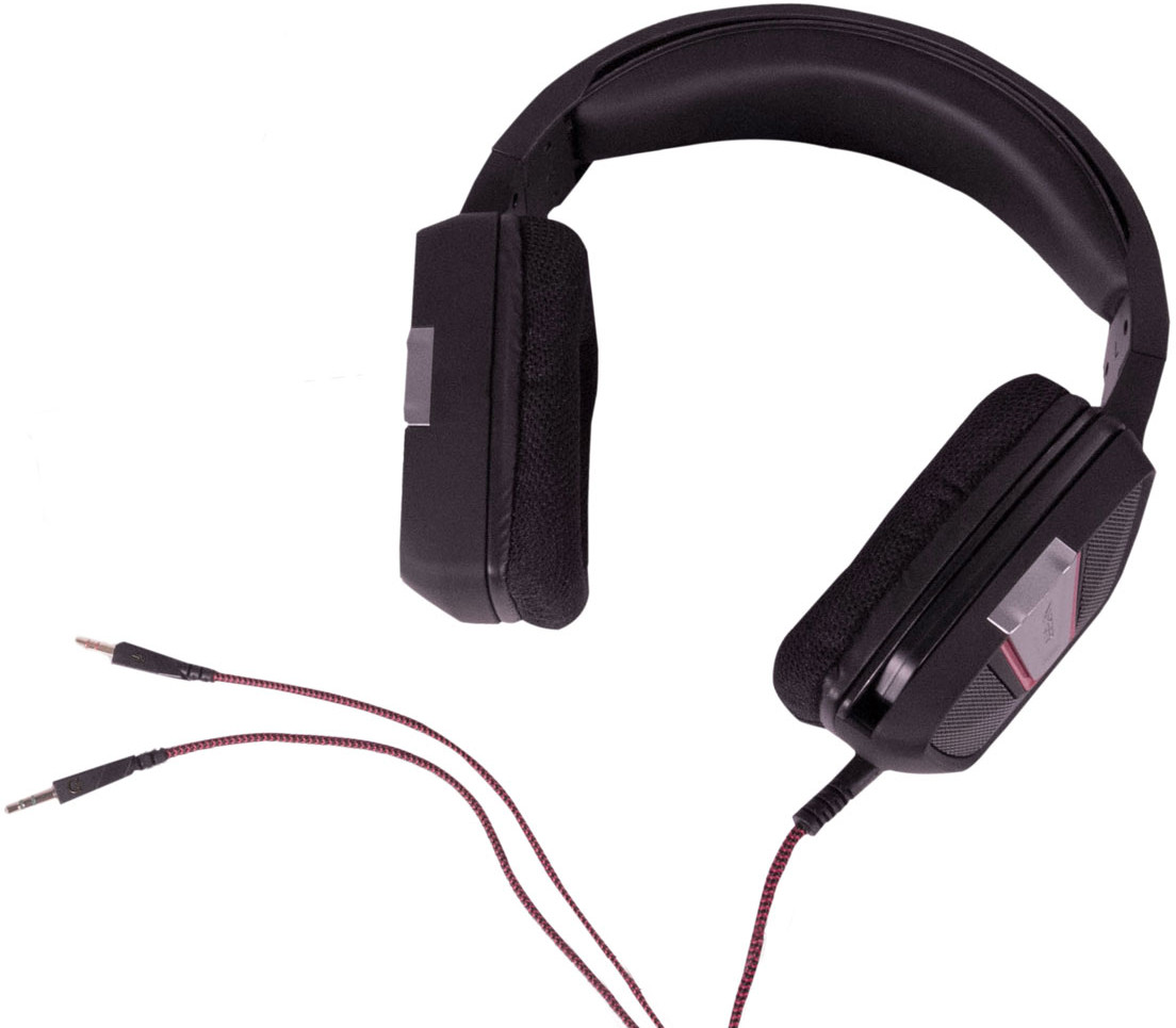 Наушники Patriot Viper V330 обладают привлекательной и достаточно брутальной внешностью. Черный матовый цвет и обилие скошенных граней создают нарочито строгий вид, который весьма удачно дополняют красные элементы управления и яркая светодиодная подсветка в форме буквы "V".