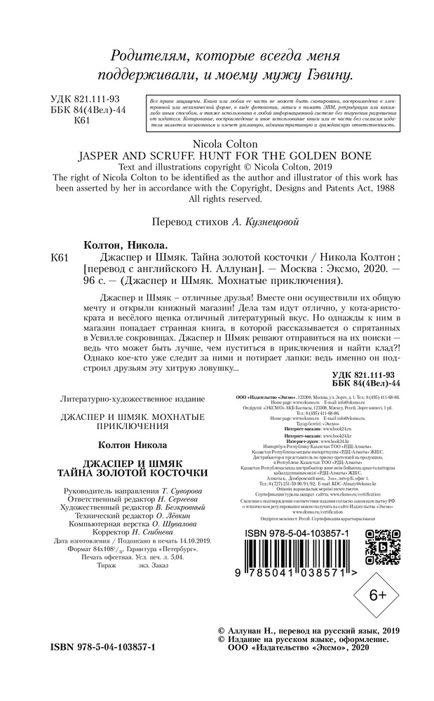 Джаспер и Шмяк. Тайна золотой косточки 2В данный момент этот товар отсутствует в продаже. Возможно, у нас найдется аналогичный или похожий товар здесь. Серия: Детск. Джаспер и Шмяк. Мохнатые приключения Джаспер и Шмяк — отличные друзья! Вместе они осуществили их общую мечту и открыли книжный магазин! Дела там идут отлично, у кота-аристократа и весёлого щенка отличный литературный вкус. Но однажды к ним в магазин попадает странная книга, в которой рассказывается о спрятанных в Усвилле сокровищах. Джаспер и Шмяк решают отправиться на их поиски — ведь что может быть лучше, чем пуститься в приключения и найти клад?! Однако кое-кто уже следит за ними и потирает лапки: ведь именно он подстроил друзьям эту хитрую ловушку... |