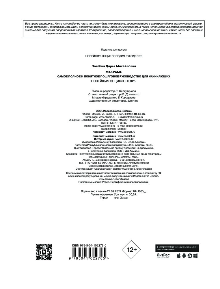 💳 Оплатить за товар можно при получении 🇰🇿 Есть бесплатная доставка по Казахстану от 1 дня 🎁 Копите бонусы с каждой покупки Серия: Новейшая энциклопедия рукоделия Макраме — вид ручного творчества, переживающий настоящую реинкарнацию! Современная тяга к натуральным материалам, экологичности, как нельзя лучше отражается в возрождающейся любви к макраме — удивительному искусству плетения из шнура, которое доступно каждому, кто захочет его освоить. Занавески, панно, абажуры, сумки, украшения, да что угодно можно сплести, освоив основы техники макраме. В этом поможет эта подробная и красивая книга от известного мастера и блогера Дарьи Потебня, больше известной под ником @yarangaa! Узнаваемый стиль автора отразился на всей книге: легкий и образный язык, подробнейшие пошаговые иллюстрации, все основы техники и удивительные авторские работы, на примере которых вы будете осваивать азы мастерства. А в результате сможете научиться создавать удивительные вещи для интерьера или в подарок родным и близким. |