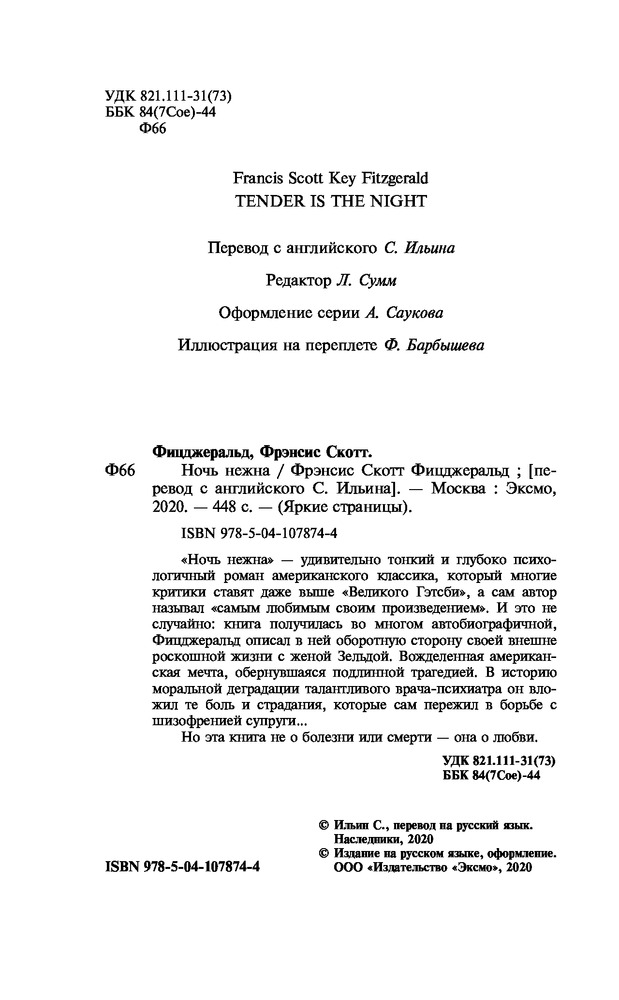 Ночь нежнаВ данный момент этот товар отсутствует в продаже. Возможно, у нас найдется аналогичный или похожий товар здесь. Серия: Яркие страницы «Ночь нежна» — удивительно тонкий и глубоко психологичный роман американского классика, который многие критики ставят даже выше «Великого Гэтсби», а сам автор называл «самым любимым своим произведением». И это неслучайно: книга получилась во многом автобиографичной, Фицджеральд описал в ней оборотную сторону своей внешне роскошной жизни с женой Зельдой. Вожделенная американская мечта, обернувшаяся подлинной трагедией. В историю моральной деградации талантливого врача-психиатра он вложил те боль и страдания, которые сам пережил в борьбе с шизофренией супруги... Но это книга не о болезни или смерти — она о любви. |