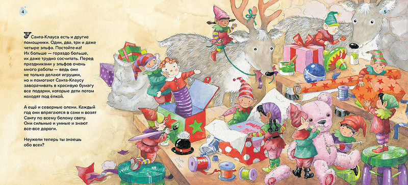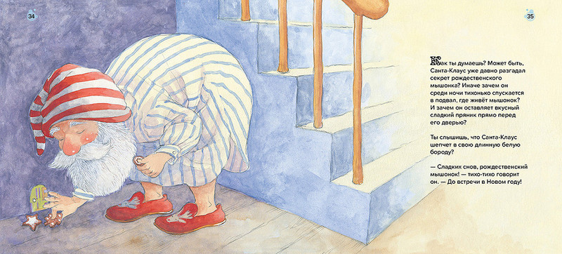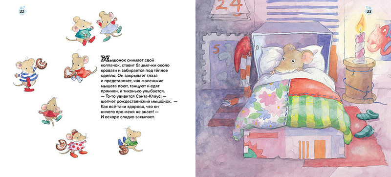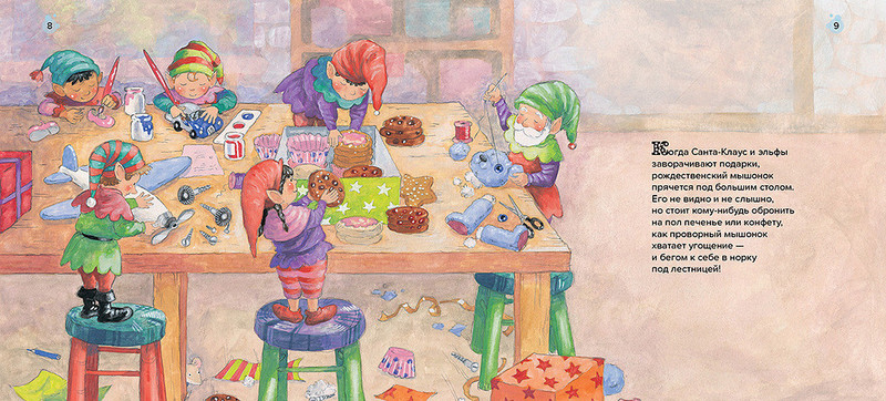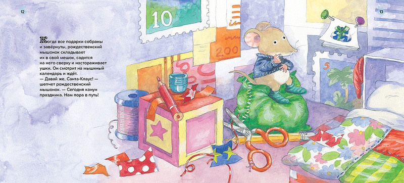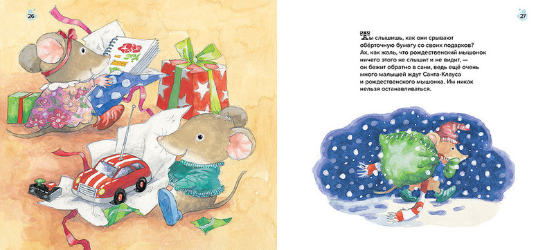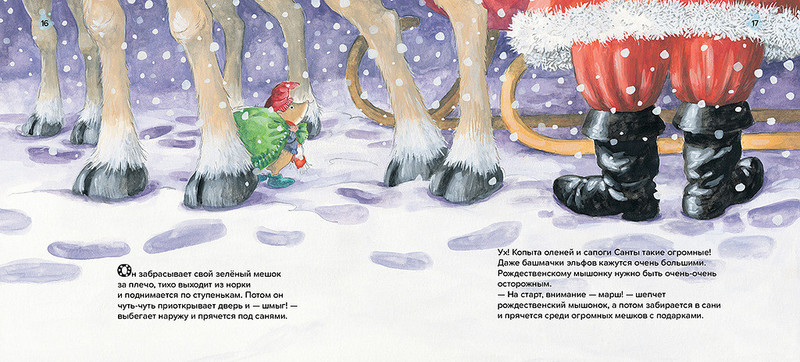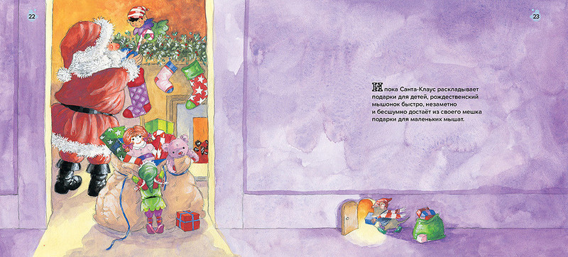 Санта-Клаус знает всех-всех детей на свете, но даже он не знает о том, что в его доме живёт рождественский мышонок. Это большой секрет, потому что мышонок очень хорошо прячется. Когда Санта заворачивает подарки, мышонок внимательно следит за тем, что падает на пол, — игрушечные машинки, мраморные шарики, цветные ленточки... Затем, уже в своей норке, рождественский мышонок готовит подарки для маленьких мышат и вместе с Санта-Клаусом — только тайком — отправляется раздавать гостинцы. |