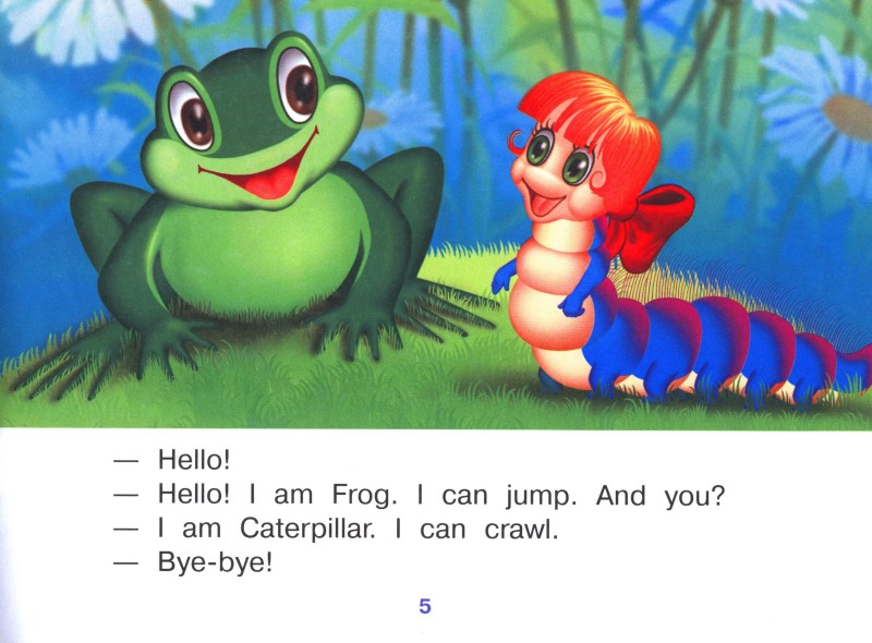 Очень хорошая книга простой текст и яркие картинки, поможет деткам узнать о том что, например, лягушка прыгает, а гусеница ползает.