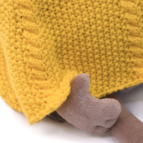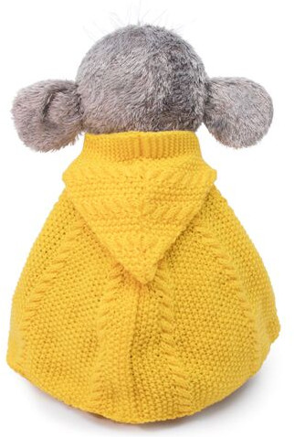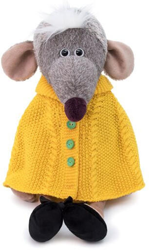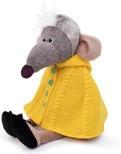 Крыса Фрея в добротной, связанной косами пелерине из акрила одуванчикового цвета. Пелерина связана с капюшоном, а спереди украшена зелёными деревянными пуговками.