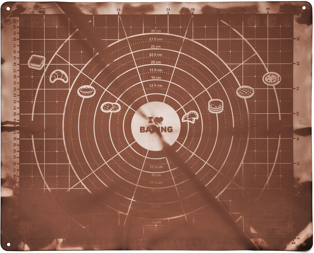 Размеры бледные. Коврик как коврик. Думала красивее будет чем китайские аналоги. Но нет. Лучше бы китайские купила. Оставила. Как силиконовый коврик полностью отвечает всем требованиям. Только отметки слишком бледные.