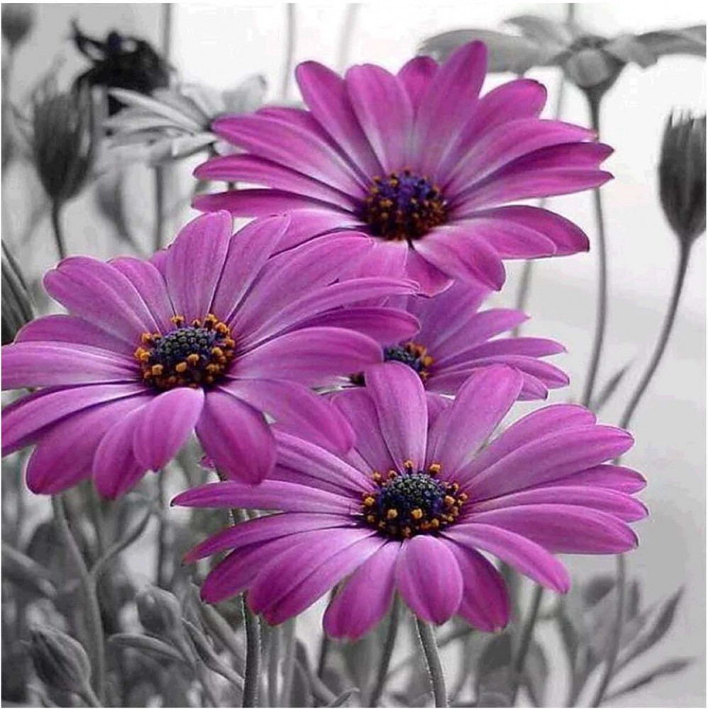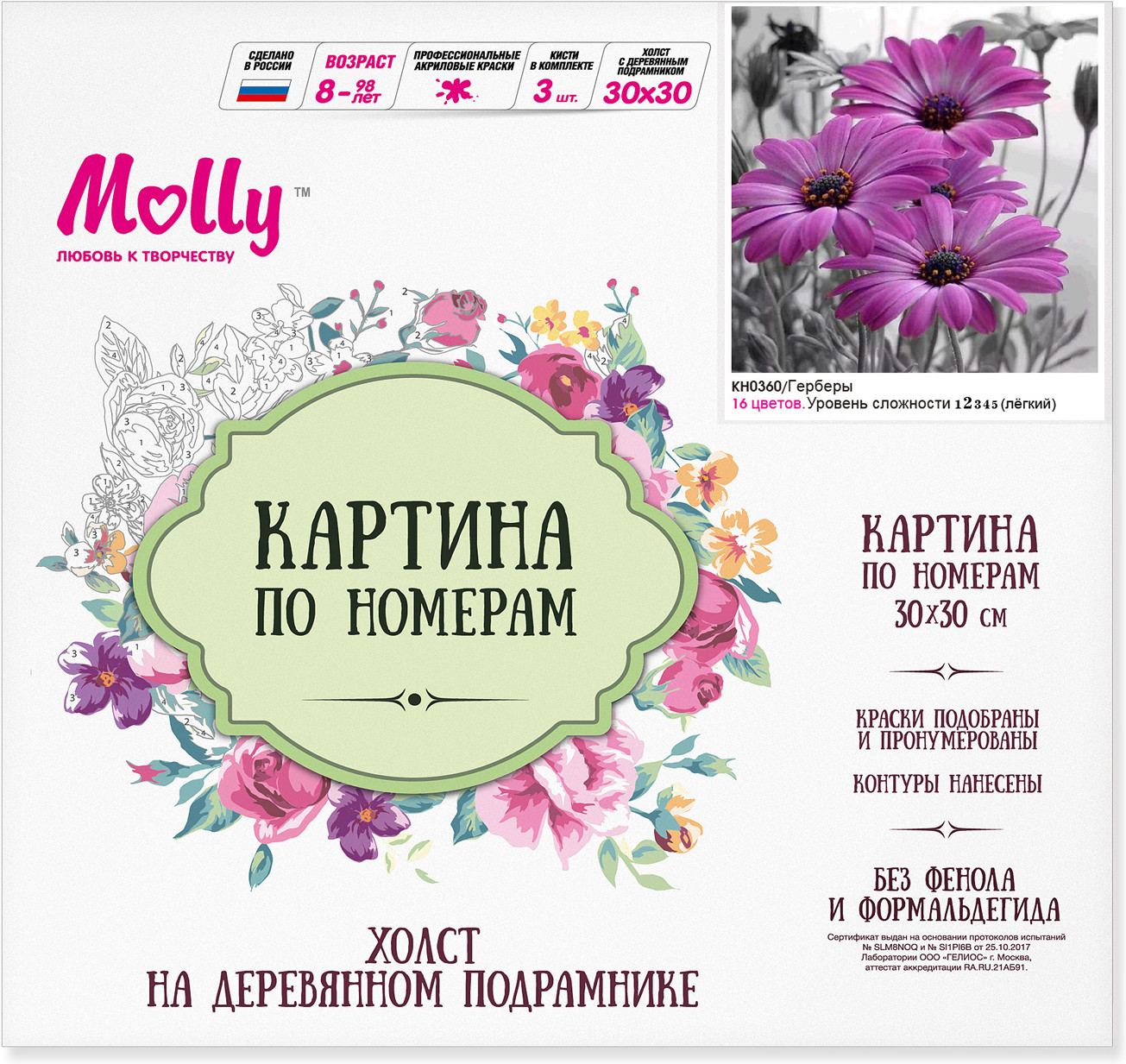 Используя набор для творчества Молли, можно нарисовать фиолетовые герберы. Контур изображения нанесен на холст и разбит на сегменты с номерами. Краску следует выбирать в соответствии с нанесенным номером.