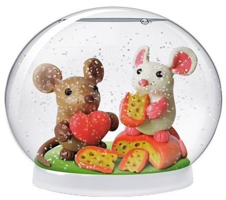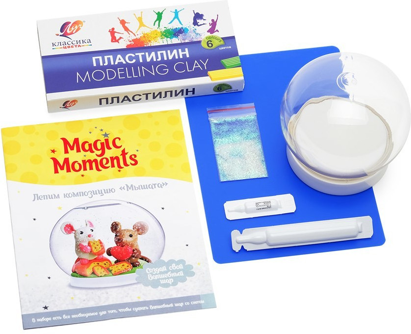 Шар состоит из пластиковой сферы и плотно завинчивающейся крышки, которая не пропускает воду. Слепите фигурку, пользуясь нашей пошаговой инструкцией. Прикрепите готовую композицию к крышке, добавьте в сферу воду с глицерином и блестками, а затем аккуратно соедините две части шара. Ваш Волшебный шар готов! Вы можете дарить его как самостоятельный сувенир, а можете познакомить близких с этим набором для творчества, который научит их новому хобби.