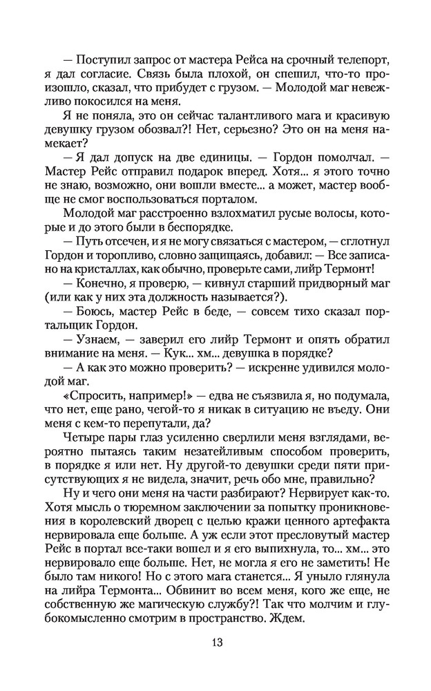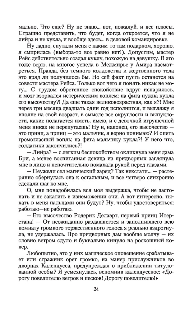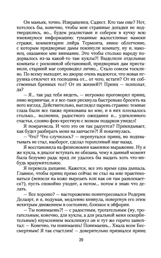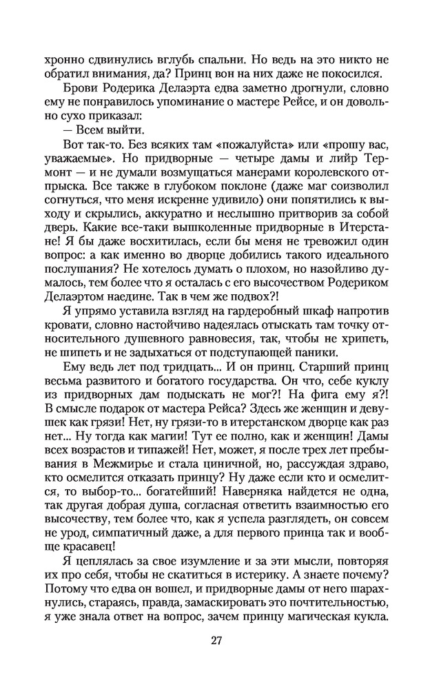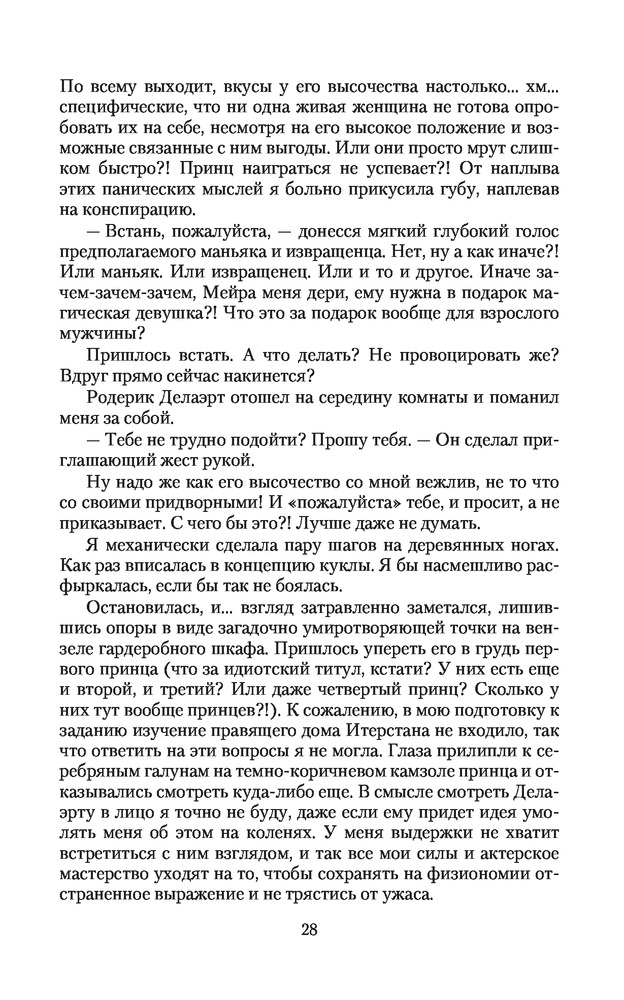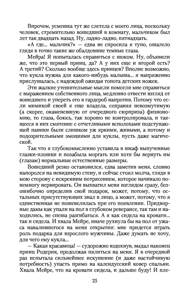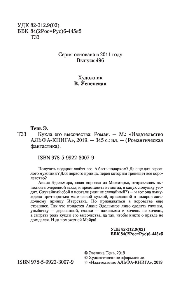 Анаис Эдельмира, юная воровка из Межмирья, отправляясь выполнять очередной заказ, и представить не могла, в какую ловушку угодит. Случайный сбой в портале (или не случайный?) — и вот она вынуждена притворяться магической куклой, присланной в подарок загадочному принцу Итерстана. Но признаваться в воровстве еще страшнее. Так что придется Анаис Эдельмире лицо сделать глупым, улыбочку — деревянной, глазки — наивными и хочешь не хочешь, а сыграть роль куклы его высочества, да так, чтобы никто о правде не догадался. И да поможет ей Мейра! |