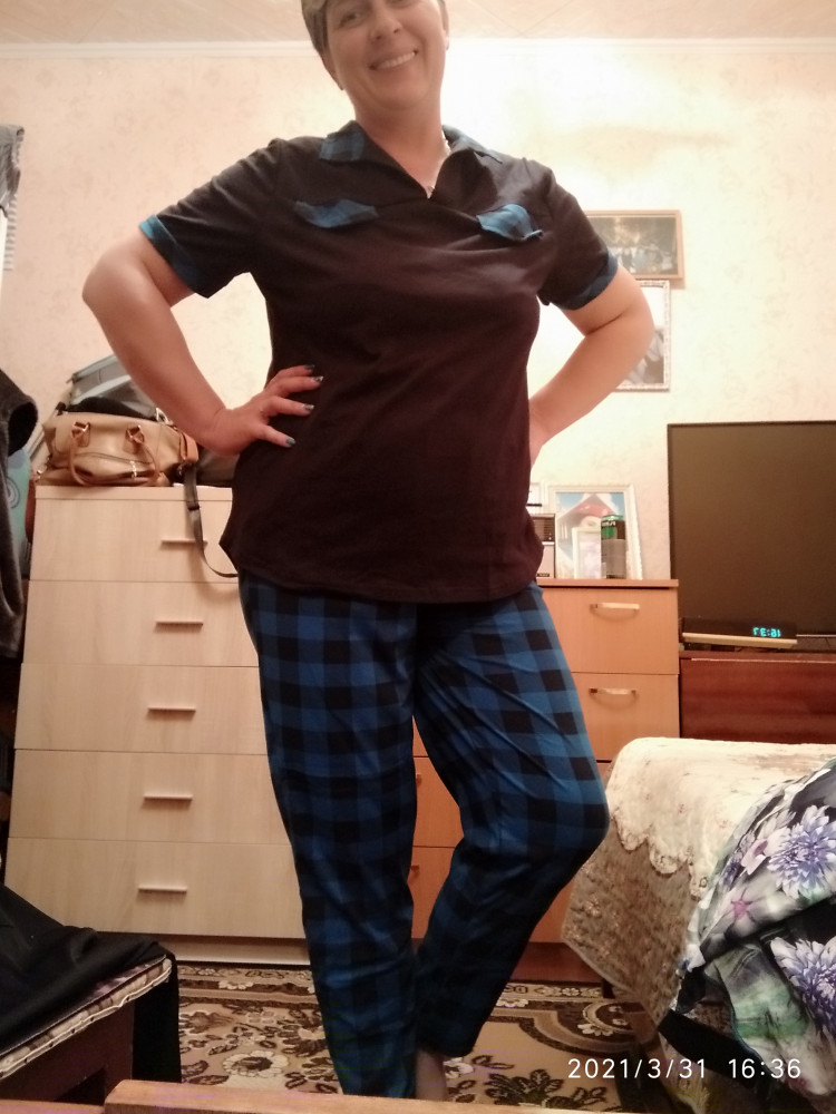 Отличный домашний х/б костюм, размер в размер, удобные очень брючки, футболка посвободнее сидит, для дома самое-то.