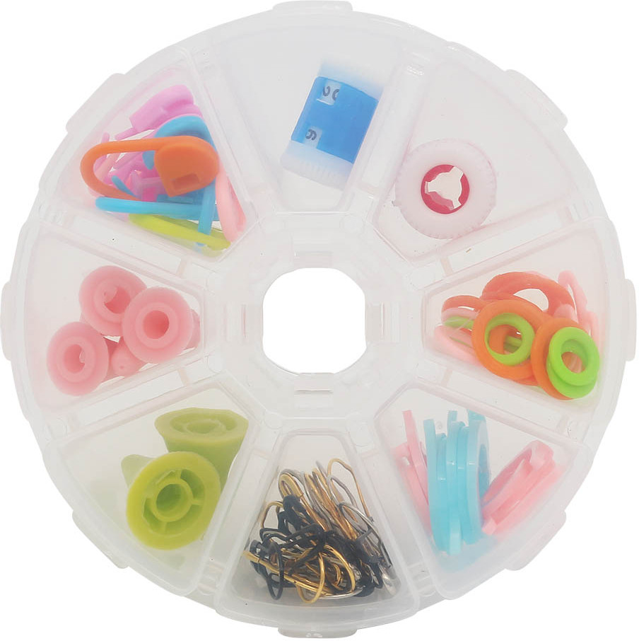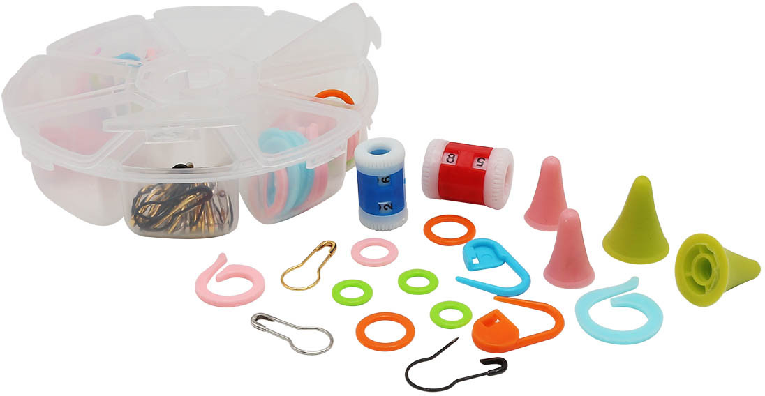 Очень хороший набор, качественные маркеры 4 вида, два счетчика рядов, наконечники на спицы 2 размеров. Очень довольна.