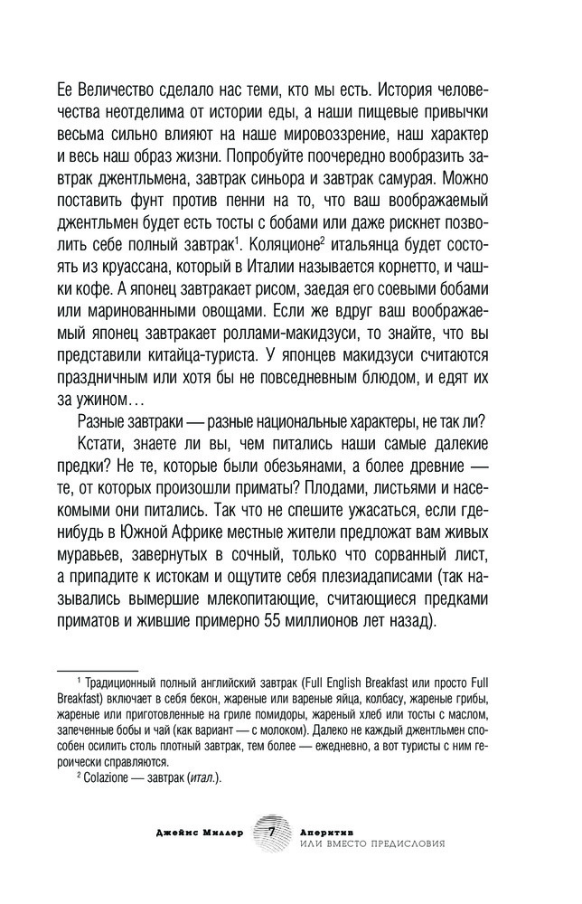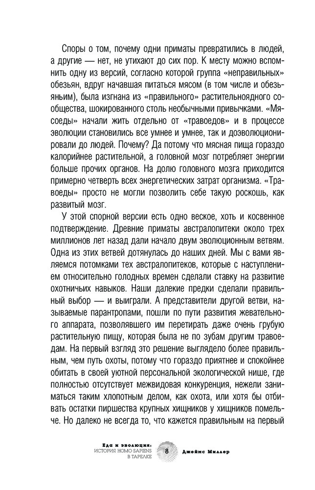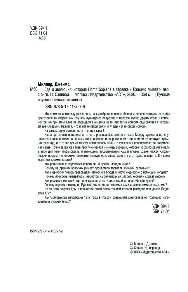 Еда и эволюция. История Homo Sapiens в тарелкеВ данный момент этот товар отсутствует в продаже. Возможно, у нас найдется аналогичный или похожий товар здесь. Серия: Лучшие научно-популярные книги Мы едим по нескольку раз в день, мы изобретаем новые блюда и совершенствуем способы приготовления старых, мы изучаем кулинарное искусство и пробуем кухню других стран и континентов, но при этом даже не обращаем внимания на то, как тесно история еды связана с историей цивилизации. Кажется, что и нет никакой связи и у еды нет никакой истории. На самом деле история есть — и еще какая! Наша еда эволюционировала, то есть развивалась вместе с нами. Между куском мяса, случайно упавшим в костер в незапамятные времена, и современным стриплойном существует огромная разница, и в то же время между ними сквозь века и тысячелетия прослеживается родственная связь. Точно такая же связь прослеживается и между зернами, которые когда-то размачивали в воде для того, чтобы съесть, и нынешним ассортиментом каш и пловов. Даже между католическим постом и японскими блюдами темпура есть связь, хотя и в это трудно поверить. В нашем мире все взаимосвязано! — Как религиозные верования повлияли на кухню народов мира? — Почему на древних арабских рынках процветала торговля живыми баранами? — Как индийские повара превращали заморские блюда в чисто индийские с помощью йогурта? — Почему японские императоры, несмотря на религиозный запрет, кормили солдат мясом? — Как развитие морской торговли сказалось на итальянской и византийской кухне? — Почему тюркские манты на Русской земле стали экономичными и маленькими пельменями? — Из-за чего покупка еды и пряностей стала значительной статьей расходов при дворе Людовика XIV? — Как Октябрьская революция 1917 года в России разрушила многовековую традицию изготовления русских блюд? |