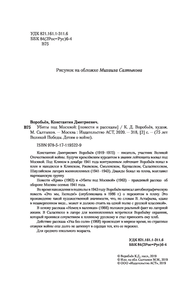 Серия: 75 лет Великой Победы. Детям о войне Константин Дмитриевич Воробьёв (1919-1975) — писатель, участник Великой Отечественной войны. Будучи кремлёвским курсантом, в звании лейтенанта воевал под Москвой. Под Клином в декабре 1941 года контуженным лейтенант Воробьёв попадает в плен и находился в Клинском, Ржевском, Смоленском, Каунасском, Саласпилсском, Шяуляйском лагерях военнопленных (1941-1943). Дважды бежал из плена, возглавил партизанскую группу. |