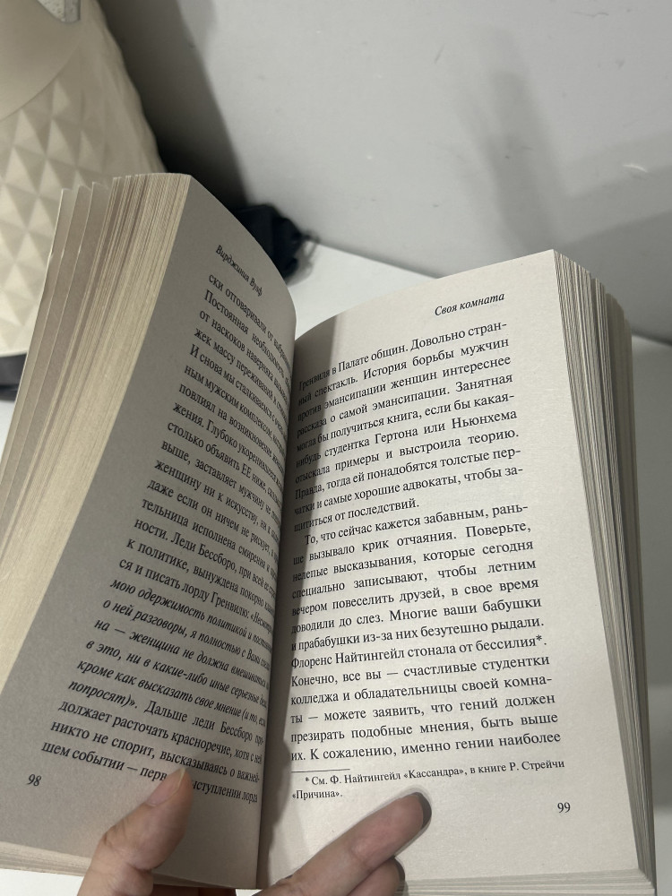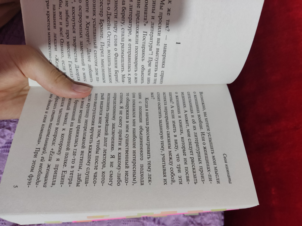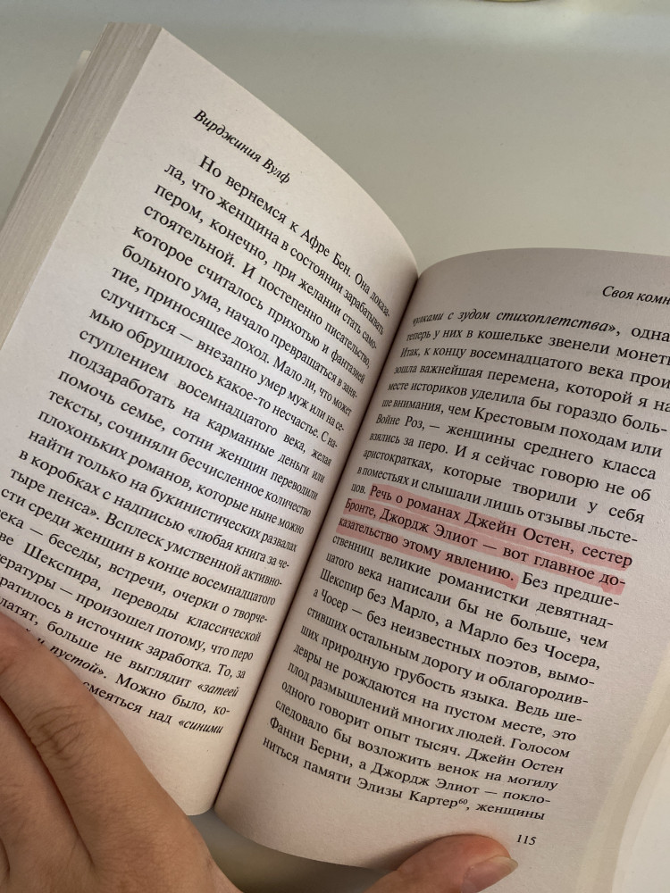 книга очень сильно мне запомнилась, до этого не читала работы Вирджинии Вульф, но это эссе навсегда осталось в моей памяти, ведь это особенно актуально сейчас она поднимает действительно важные вещи такие как образование женщины, её положение в обществе, даже коснулась истории суфражисток и так далее. это книга в моём сердце, теперь буду читать другое её творчество