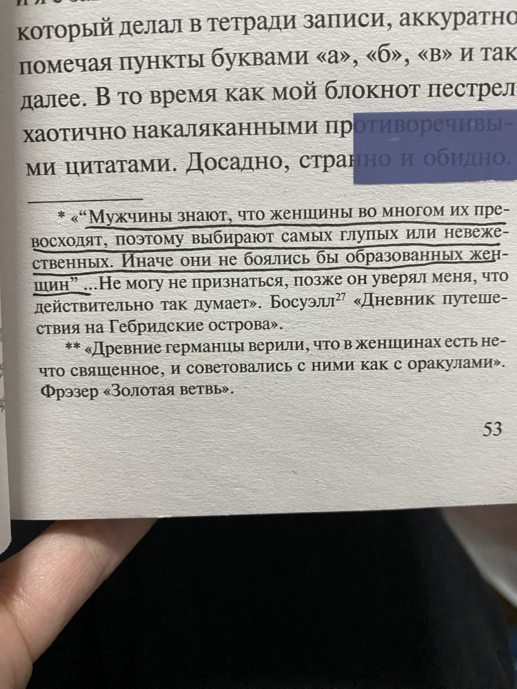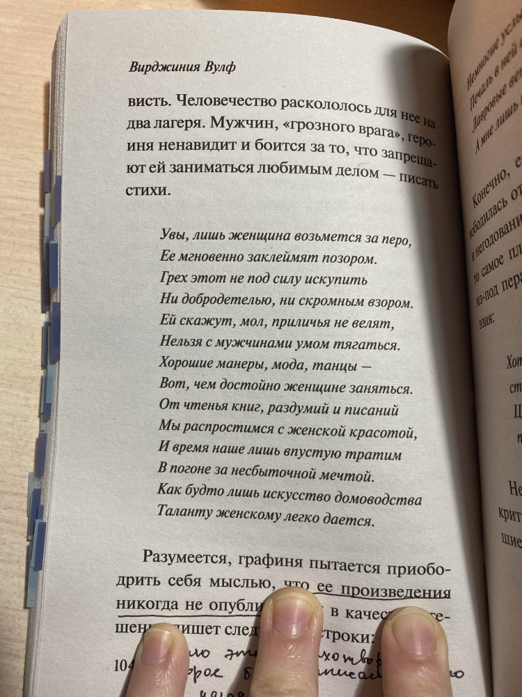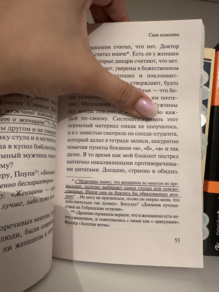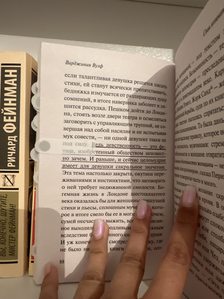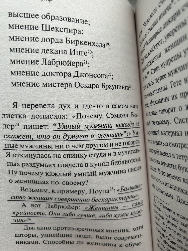 Я в восторге от этой книги! Выделила для себя много цитат — потрясающе, как Вульф рассуждает и поднимает важные темы, такие как роль и права женщины в обществе. Её мысли остаются актуальными и сегодня, заставляя задуматься и переосмыслить многое. Считаю, что каждая женщина должна обязательно прочитать эту книгу. ❤️🩹🫂