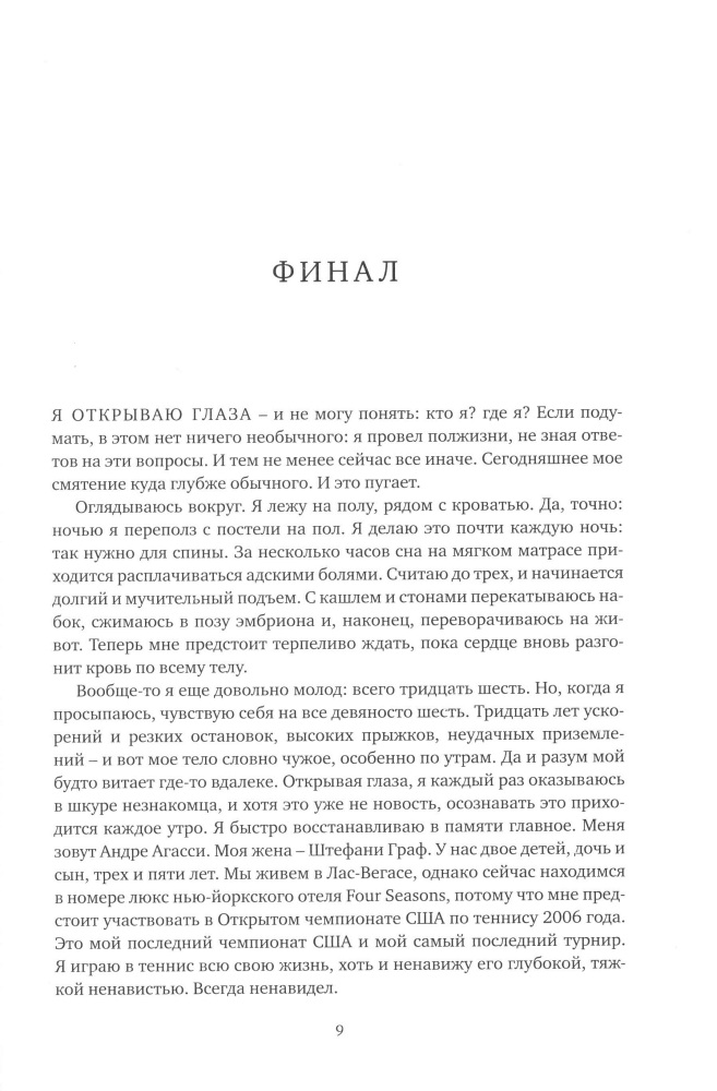 Книга порадовала качеством - приятная печать, белейшая бумага. Жаль, что фотографий не очень много. А текст просто прекрасен - в нем колоссальный тридцатилетний труд Агасси, его характер, честный взгляд на себя и соперников. И масса подробностей, которые никаким другим путем не узнать фанату тенниса, если не прочесть эту книгу.