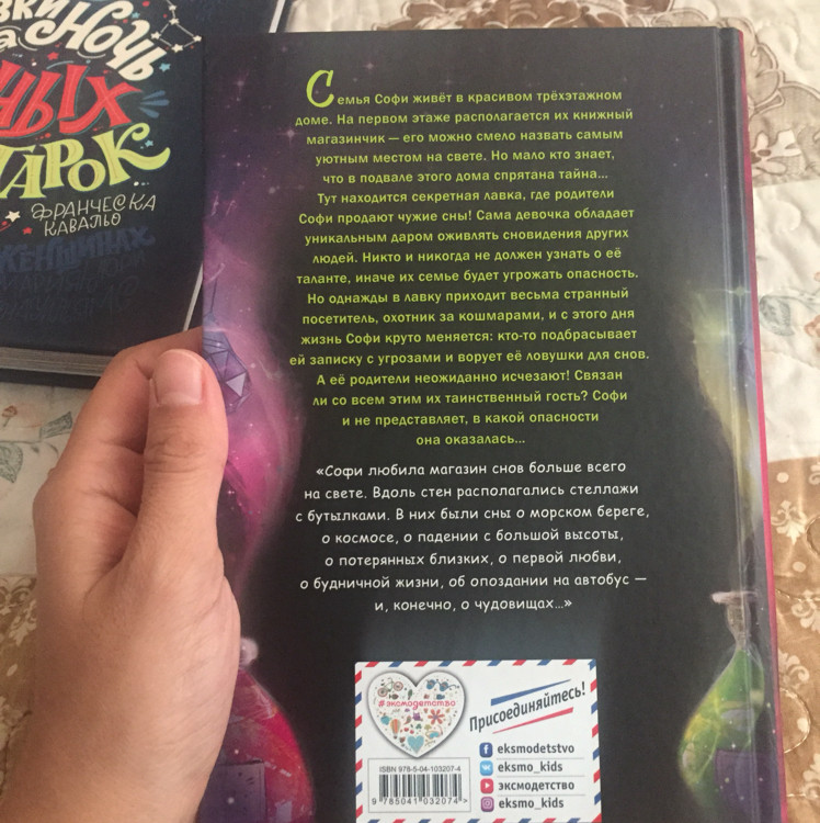 💳 Оплатить за товар можно при получении 🇰🇿 Есть бесплатная доставка по Казахстану от 1 дня 🎁 Копите бонусы с каждой покупки Серия: Детская. Фэнтези для подростков Семья Софи живёт в красивом трёхэтажном доме, на первом этаже которого располагается уютный книжный магазинчик. Но мало кто знает, что в подвале этого дома спрятана тайна... Тут находится секретная лавка, где родители Софи продают чужие сны! Однажды в лавку приходит весьма странный посетитель, охотник за кошмарами, и с этого дня жизнь Софи переворачивается с ног на голову. Кто-то подбрасывает ей записку с угрозами, а её родители... неожиданно исчезают! Связан ли с этим их таинственный гость? Софи и не представляет, в какой опасности она оказалась... |