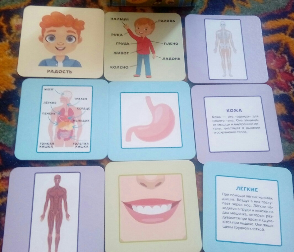 Очень классные карточки!!! Когда брала думала будут просто органы с описанием, но какой восторг когда увидела, что внутри)))Карточки 4-х цветов: 1 - основные составляющие нашего тела; 2 - внешние органы человека; 3 - внутренние органы человека; 4 - основные эмоции (вот такого вообще не ожидала)) Сзади карточек понятное описание. Карточки как по одному органу, так есть карточки, где полностью человек и обозначены его органы. Восторг, рекомендую 100 %. Дочери 1 год и 8 месяцев сразу начала показывать свои внешние органы в сравнении с карточками