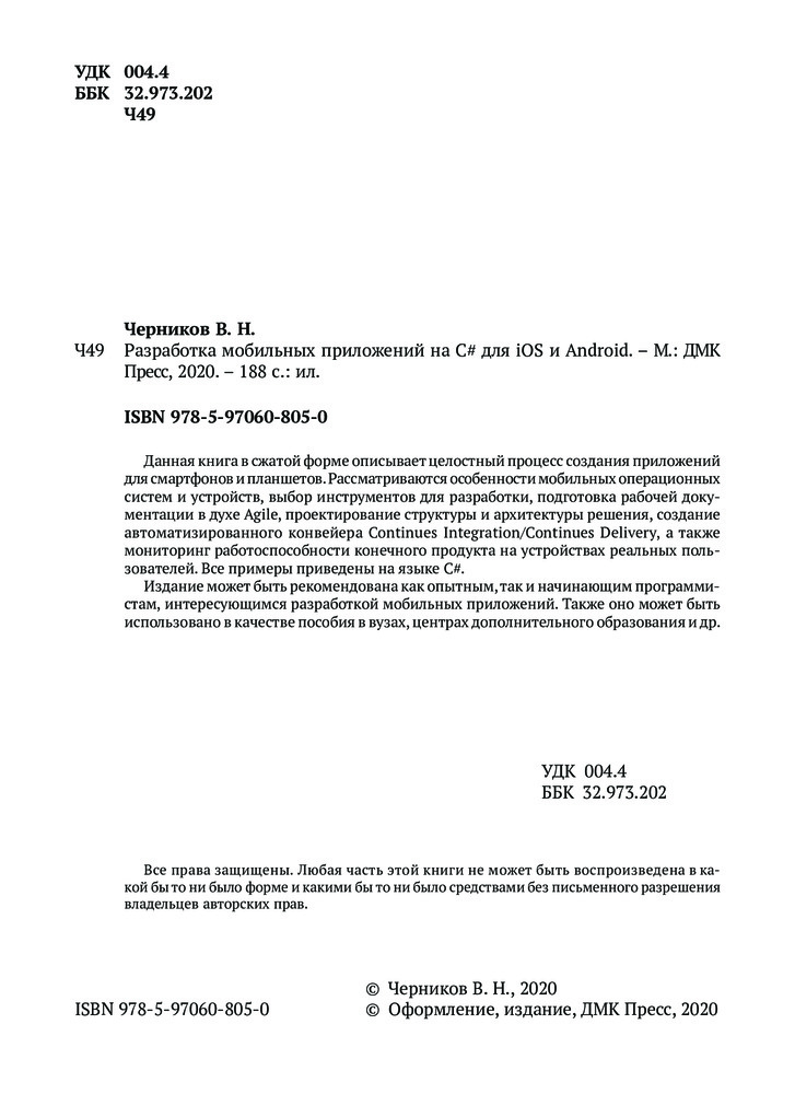 💳 Оплатить за товар можно при получении 🇰🇿 Есть бесплатная доставка по Казахстану 🎁 Копите бонусы с каждой покупки Данная книга в сжатой форме описывает целостный процесс создания приложений для смартфонов и планшетов. Рассматриваются особенности мобильных операционных систем и устройств, выбор инструментов для разработки, подготовка рабочей документации в духе Agile, проектирование структуры и архитектуры решения, создание автоматизированного конвейера Continues Integration/Continues Delivery, а также мониторинг работоспособности конечного продукта на устройствах реальных пользователей. Все примеры приведены на языке C#. |