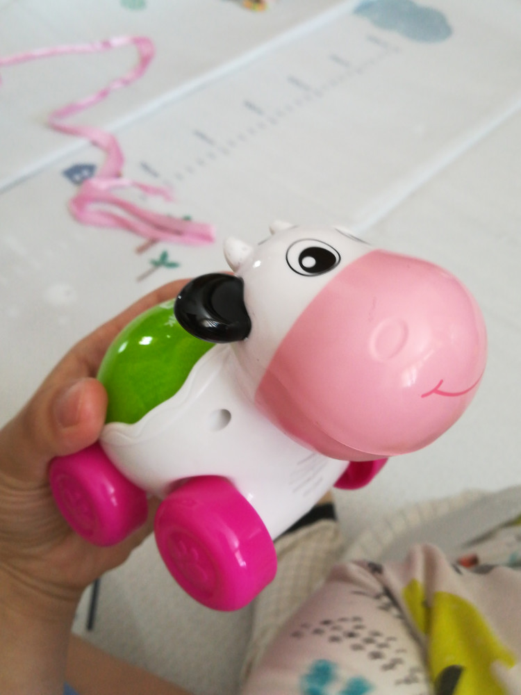 Добавлю. Сейчас сыну 3,5, а покупали коровку в 8 месяцев. Она до сих пор работает!!! Краска местами облезла, но игрушка рабочая!!!