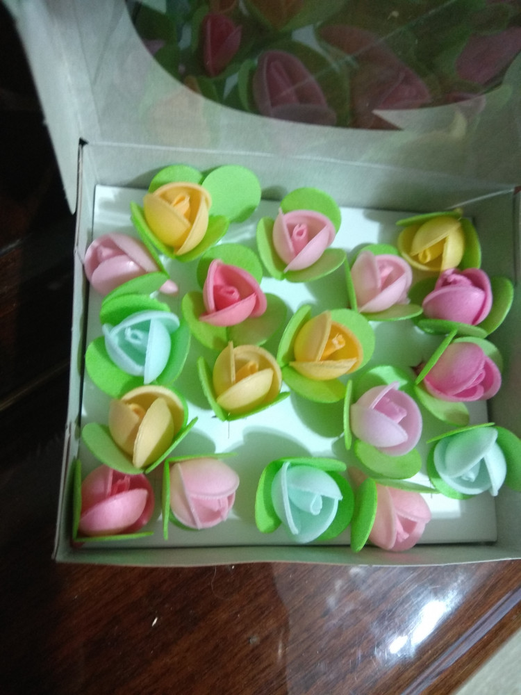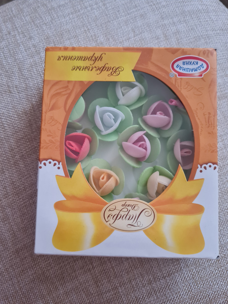 Пришли розочки (не ромашки как на фото) цвета пастельные, аккуратные небольшие, взяла для куличей. Все целое.