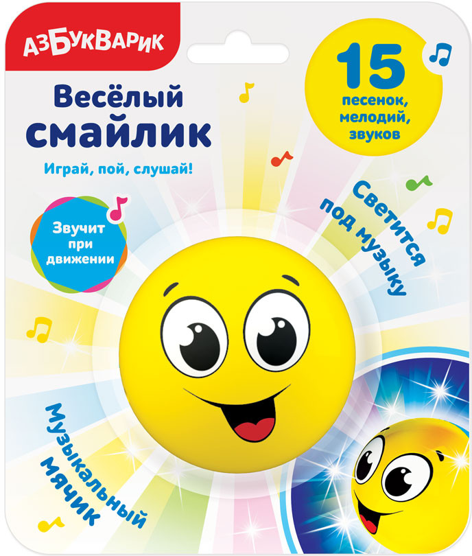 Азбукварик Мячик музыкальный «Веселый смайлик»В данный момент этот товар отсутствует в продаже. Возможно, у нас найдется аналогичный или похожий товар здесь. Суперпопулярный образ смайлика — теперь в виде музыкальной игрушки для детей! Жизнерадостный улыбающийся колобок развеселит любого малыша! Он задорно смеется, поет песенки («Я весёлый мячик», «Чижик-пыжик»), проигрывает мелодии с множеством смешных звуков («По секрету всему свету», «Полька» и др.). Катай мячик — он звучит при движении и светится разноцветными огоньками. Игрушка легко включается и выключается с помощью тумблера. Выбери свой цвет смайлика: красный, желтый, голубой или зеленый! |