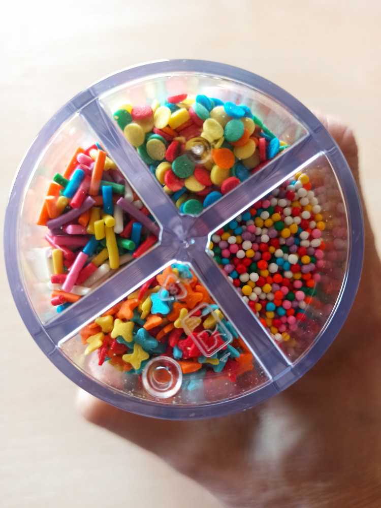 Отличная и очень удобная баночка ,у каждой посыпки отдельное окошко. Объем большой, хватит надолго. Потом в баночку можно насыпать другую посыпку