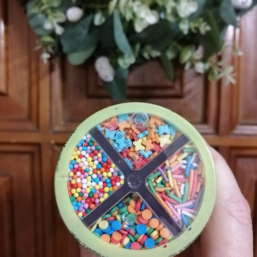 Для меня оказалась неудобная упаковка, когда декорируешь поверхность, посыпка разлетается в разные стороны: на стол и даже на пол. Пришлось высыпаться в блюдце и украшать вручную