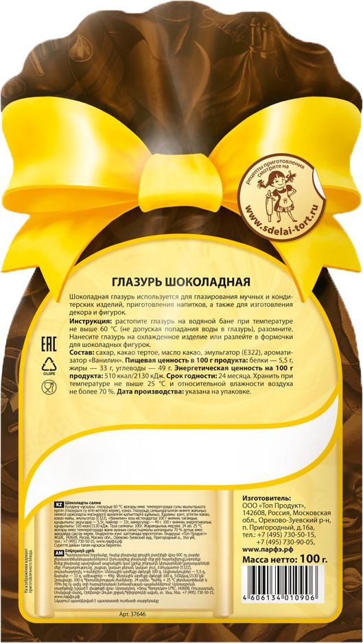 Парфэ Глазурь шоколаднаяВ данный момент этот товар отсутствует в продаже. Возможно, у нас найдется аналогичный или похожий товар здесь. Шоколадная глазурь используется для глазирования мучных и кондитерских изделий, приготовления напитков, а также для изготовления декора и фигурок. |