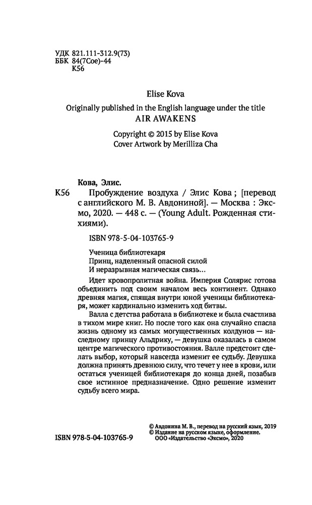 Пробуждение воздухаВ данный момент этот товар отсутствует в продаже. Возможно, у нас найдется аналогичный или похожий товар здесь. Серия: Young Adult. Рожденная стихиями Ученица библиотекаря Принц, наделенный опасной силой И неразрывная магическая связь... Идет кровопролитная война. Империя Солярис готова объединить под своим началом весь континент. Однако древняя магия, спящая внутри юной ученицы библиотекаря, может кардинально изменить ход битвы. Валла с детства работала в библиотеке и была счастлива в тихом мире книг. Но после того, как она случайно спасла жизнь одному из самых могущественных колдунов — наследному принцу Альдрику — девушка оказалась в самом центре магического противостояния. Валле предстоит сделать выбор, который навсегда изменит ее судьбу. Девушка должна принять древнюю силу, что течет у нее в крови, или остаться ученицей библиотекаря до конца дней, позабыв свое истинное предназначение. Одно решение изменит судьбу всего мира. |