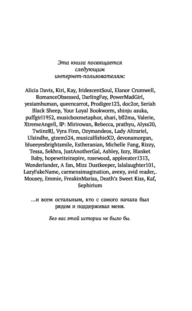 Божечки!Эта книга просто "вау".И еще я славила краш на второго главного героя!!!Господи и я так ревела когда случился такой расколбасный Хэппи Энд у главных героев!Так как если не читать все сначала то можно подумать что они друг-другу не ахти подходят...Но для меня это достижение!Перечетала все части за месяца так два,даже вроде и меньше если припомню!Я плакала,радовалась,злилась(злилась кстати очень много?!) и просто вштырило от Хэппи Энда.Это просто передоз милоты!!!!