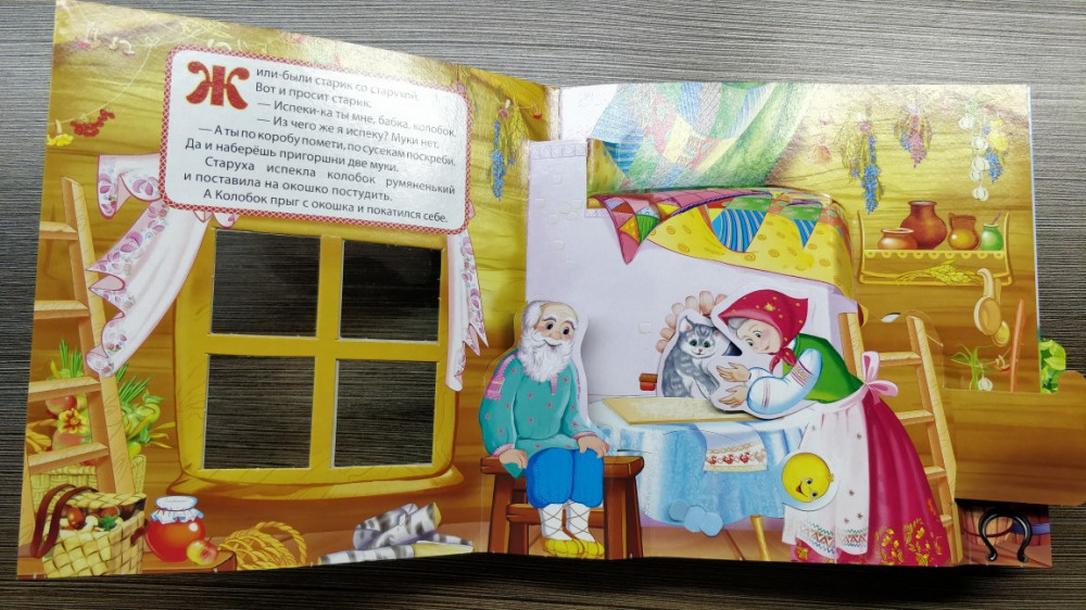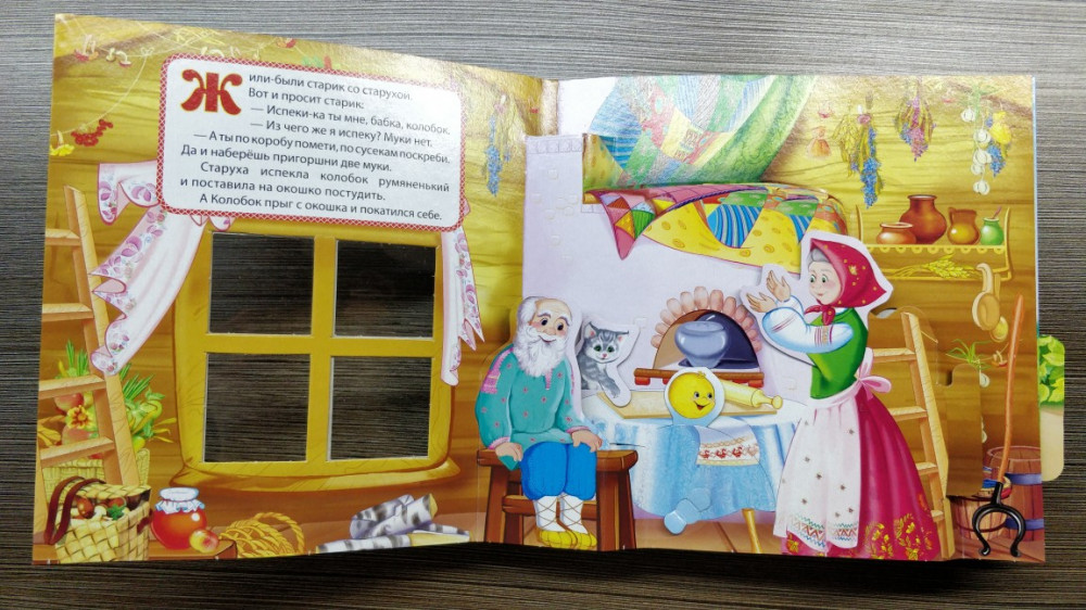 Отличная книга с красочными иллюстрациями и подвижными элементами. Пока взрослые читают, ребёнок может "оживлять" и приводить в движение персонажей сказки. Единственный минус - отсутствие изображения встречи Колобка с волком.