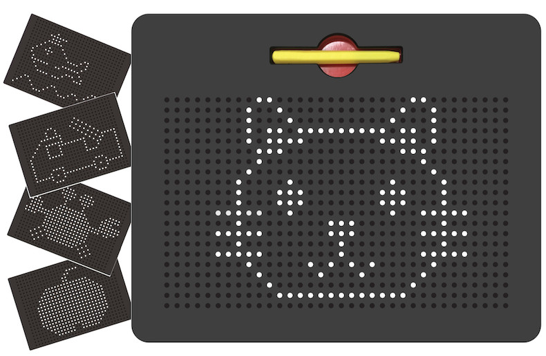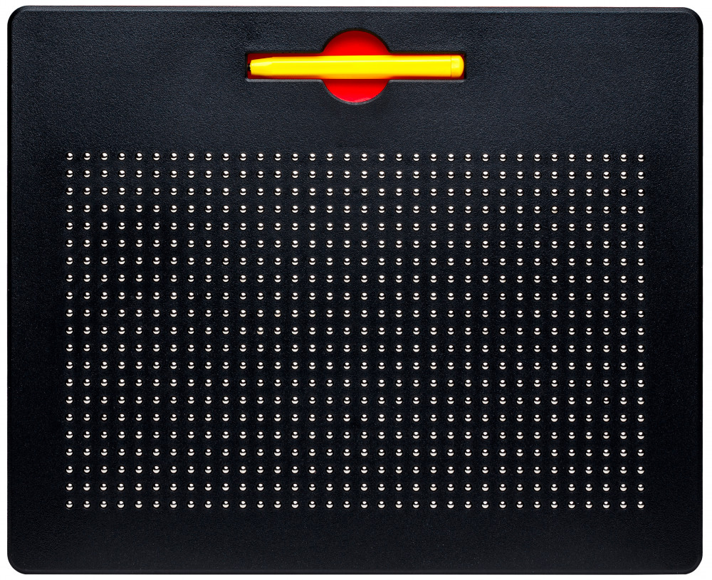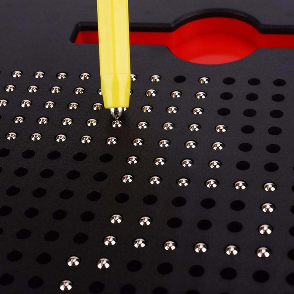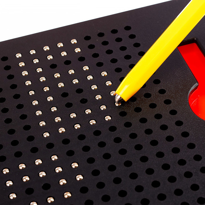 Поле для «рисования» покрыто мелкими отверстиями, к которым нужно подносить ручку с магнитным наконечником. При приближении стилуса шарик притягивается к магниту и застряет в отверстии. Проводя стилусом по поверхности планшета, формируется линия из шариков. Передвигаясь от одной дырочки к другой, можно создавать рисунки. Чтобы «стереть» изображение и вернуть шарики назад, достаточно нажать на каждый из них пальцем или приложить горизонтально к планшету и провести по доске. Любопытно то, что размер отверстий подобран идеально для того, чтобы шарики держались и не выпадали сами, но при этом, нажатия пальцем достаточно чтобы шарик зашел обратно в ячейку.