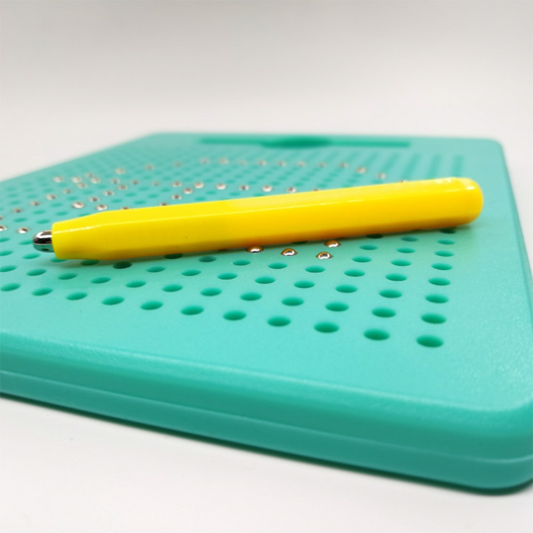 Поле для «рисования» покрыто мелкими отверстиями, к которым нужно подносить ручку с магнитным наконечником. При приближении стилуса шарик притягивается к магниту и застряет в отверстии. Проводя стилусом по поверхности планшета, формируется линия из шариков. Передвигаясь от одной дырочки к другой, можно создавать рисунки. Чтобы «стереть» изображение и вернуть шарики назад, достаточно нажать на каждый из них пальцем или приложить горизонтально к планшету и провести по доске. Любопытно то, что размер отверстий подобран идеально для того, чтобы шарики держались и не выпадали сами, но при этом, нажатия пальцем достаточно чтобы шарик зашел обратно в ячейку.
