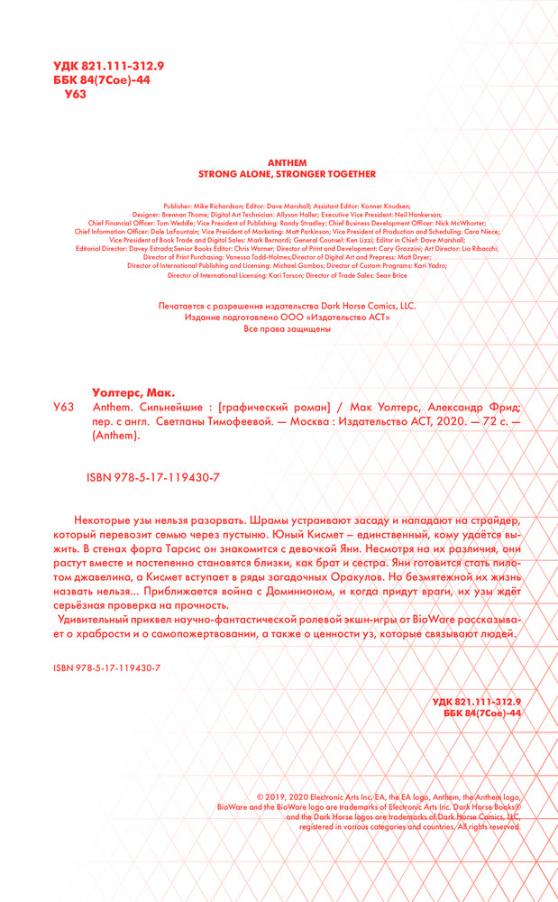 💳 Оплатить за товар можно при получении 🇰🇿 Есть бесплатная доставка по Казахстану 🎁 Копите бонусы с каждой покупки Серия: Anthem Некоторые узы нельзя разорвать. Шрамы устраивают засаду и нападают на страйдер, который перевозит семью через пустыню. Юный Кисмет — единственный, кому удаётся выжить. В стенах форта Тарсис он знакомится с девочкой Яни. Несмотря на их различия, они растут вместе и постепенно становятся близки, как брат и сестра. Яни готовится стать пилотом джавелина, а Кисмет вступает в ряды загадочных Оракулов. Но безмятежной их жизнь назвать нельзя... Приближается война с Доминионом, и когда придут враги, их узы ждёт серьёзная проверка на прочность. Удивительный приквел научно-фантастической ролевой экшн-игры от «BioWare» рассказывает о храбрости и о самопожертвовании, а также о ценности уз, которые связывают людей. |