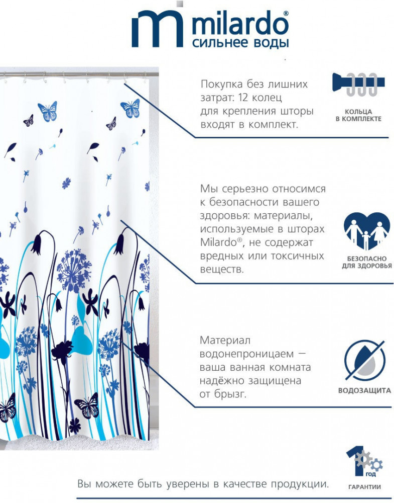 Штора «Milardo» изготовлена из полиэтиленвинилацетата (PEVA), совершенно нетоксичного и экологически чистого полимерного материала, не обладающего запахом. Шторы из PEVA 100% водонепроницаемы, достаточно прочные, эластичные, мягкие и приятные на ощупь. В верхней части шторы имеются 12 отверстий с металлическими люверсами для колец, что придает шторке большую прочность и упрощает размещение на карнизе. Люверсы изготовлены из латуни и не подвержены коррозии. В комплект шторы включен набор из 12 белых колец. Изображение нанесено специальными стойкими красителями, что делает его устойчивым к воздействию влаги и света. Шторы не рекомендуется стирать в стиральной машине, гладить и подвергать воздействию чрезмерно высокой и низкой температуры. Следует протирать штору мягкой тканью, смоченной в мыльном растворе.