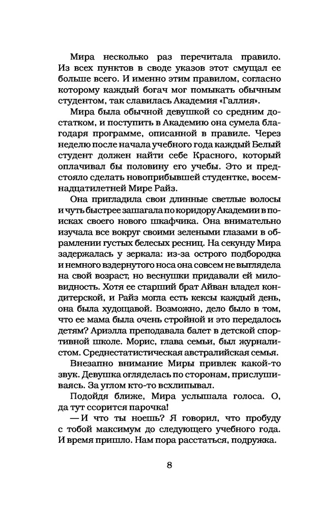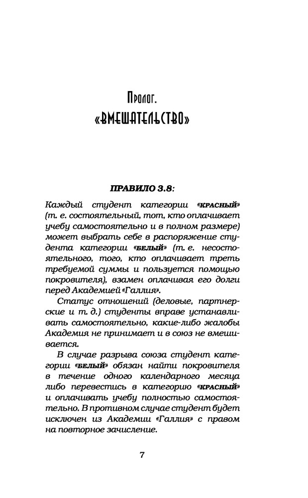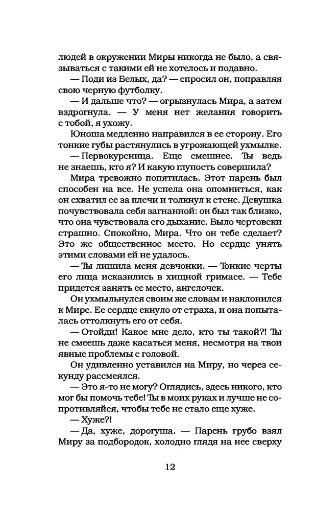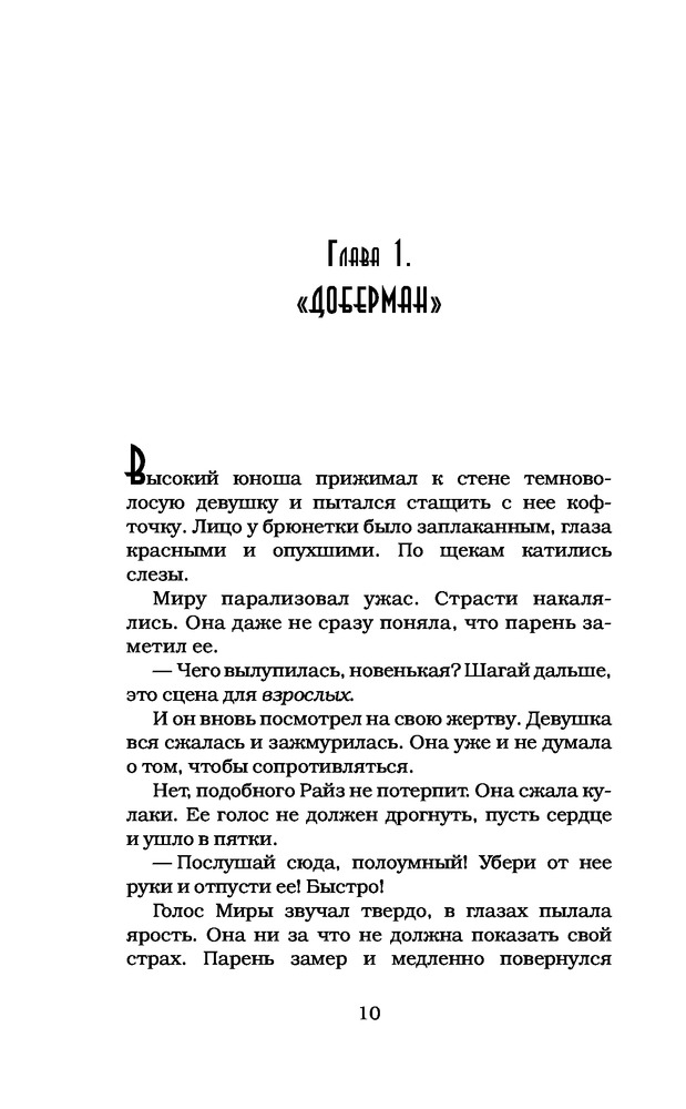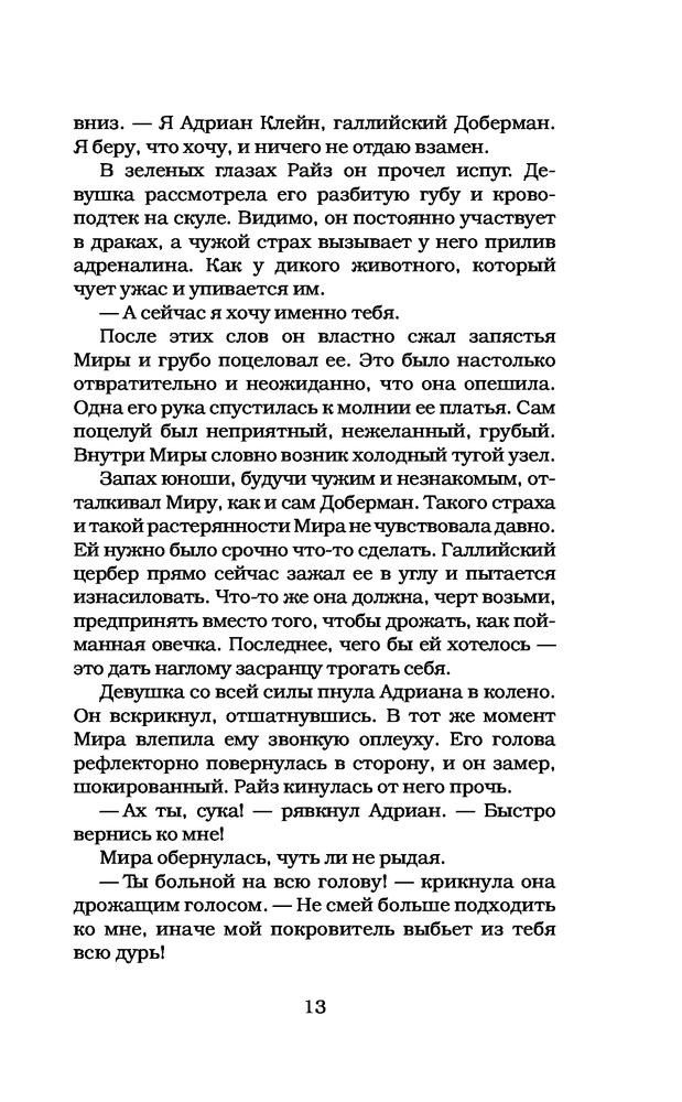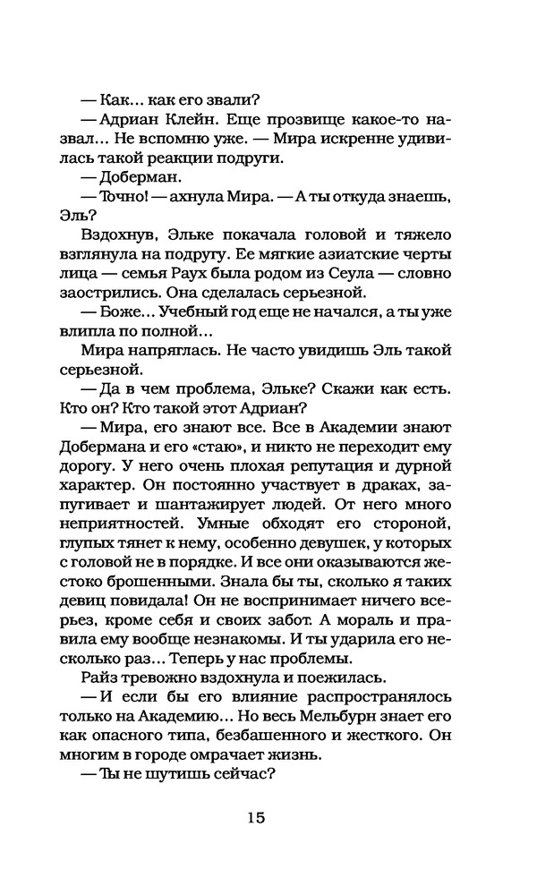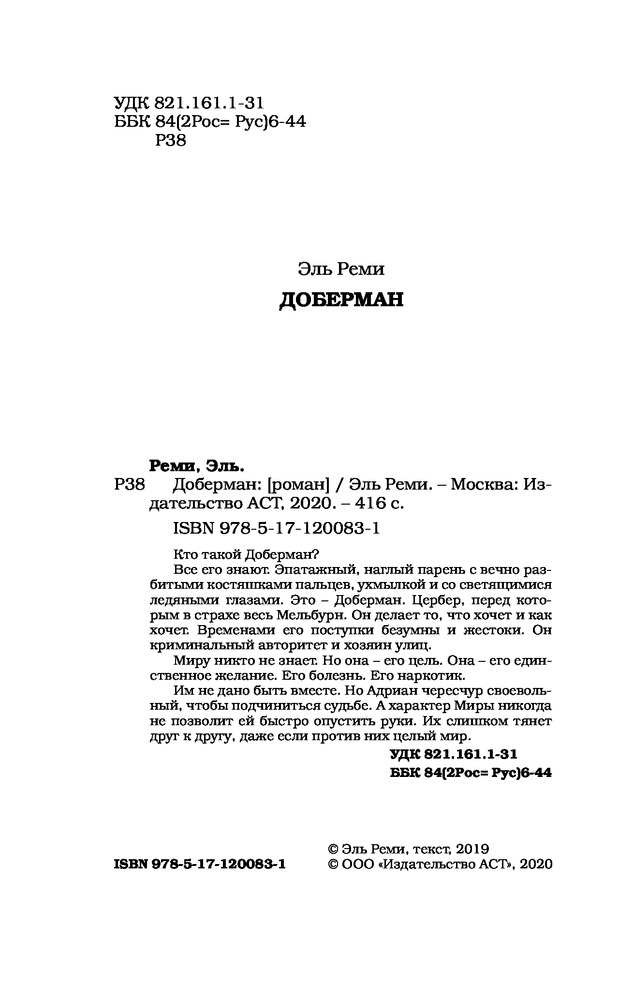 ДоберманВ данный момент этот товар отсутствует в продаже. Возможно, у нас найдется аналогичный или похожий товар здесь. Серия: Хиты Wattpad. Рискуй ради любви Кто такой Доберман? Все его знают. Эпатажный, наглый парень с вечно разбитыми костяшками пальцев, ухмылкой и со светящимися ледяными глазами. Это — Доберман. Цербер, перед которым в страхе весь Мельбурн. Он делает то, что хочет и как хочет. Временами его поступки безумны и жестоки. Он криминальный авторитет и хозяин улиц. Миру никто не знает. Но она — его цель. Она — его единственное желание. Его болезнь. Его наркотик. Им не дано быть вместе. Но Адриан чересчур своевольный, чтобы подчиниться судьбе. А характер Миры никогда не позволит ей быстро опустить руки. Их слишком тянет друг к другу, даже если против них — целый мир. Из устава Академии Галлия: «Каждый студент категории «красный» (т.е. состоятельный, тот, кто оплачивает учебу самостоятельно и в полном размере) может выбрать себе в распоряжение студента категории «белый» (т.е. несостоятельного, того, кто оплачивает треть требуемой суммы и пользуется помощью покровителя), взамен оплачивая его долги перед Академией «Галлия». Статус отношений (деловые, партнерские и т.д.) студенты вправе устанавливать самостоятельно, какие-либо жалобы Академия не принимает и в союз не вмешивается. В случае разрыва союза студент категории «белый» обязан найти покровителя в течение одного календарного месяца либо перевестись в категорию «красный» и оплачивать учебу полностью самостоятельно. В противном случае студент будет исключен из Академии «Галлия». |