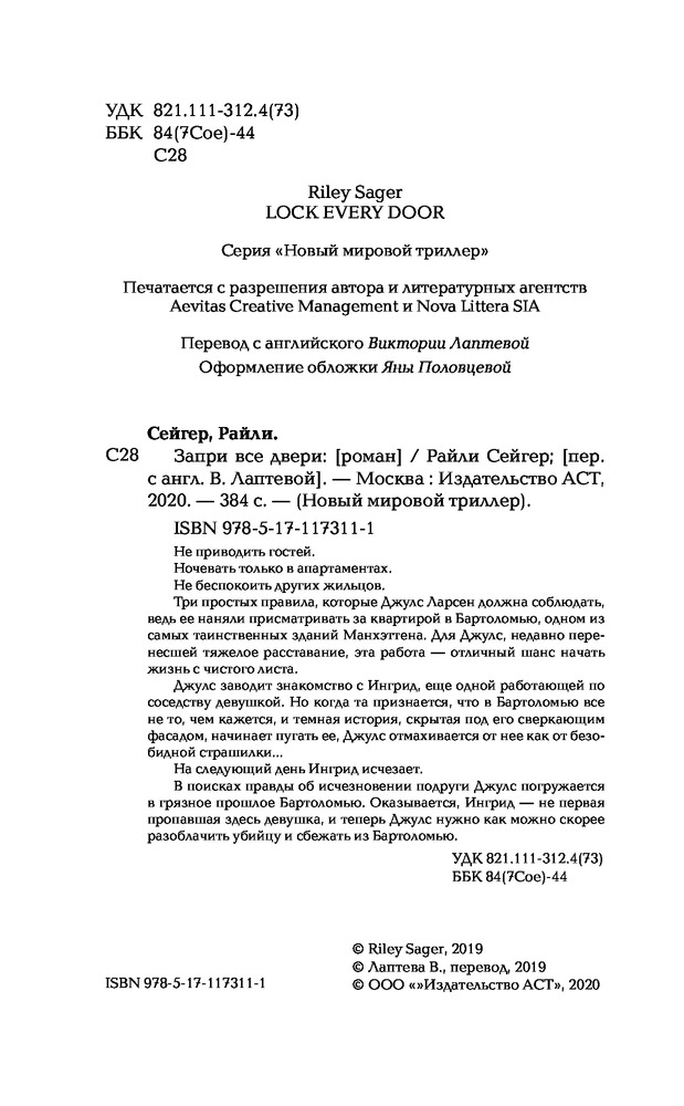 💳 Оплатить за товар можно при получении 🇰🇿 Есть бесплатная доставка по Казахстану от 1 дня 🎁 Копите бонусы с каждой покупки Серия: Новый мировой триллер Не приводить гостей. Ночевать только в апартаментах. Не беспокоить других жильцов. Три простых правила, которые Джулс Ларсен должна соблюдать, ведь ее наняли присматривать за квартирой в Бартоломью, одном из самых таинственных зданий Манхэттена. Для Джулс, недавно перенесшей тяжелое расставание, эта работа — отличный шанс начать жизнь с чистого листа. Джулс заводит знакомство с Ингрид, еще одной работающей по соседству девушкой. Но когда та признается, что в Бартоломью все не то, чем кажется, и темная история, скрытая под его сверкающим фасадом, начинает пугать ее, Джулс отмахивается от нее как от безобидной страшилки... На следующий день Ингрид исчезает. В поисках правды об исчезновении подруги Джулс погружается в грязное прошлое Бартоломью. Оказывается, Ингрид — не первая пропавшая здесь девушка, и теперь Джулс нужно как можно скорее разоблачить убийцу и сбежать из Бартоломью. |
