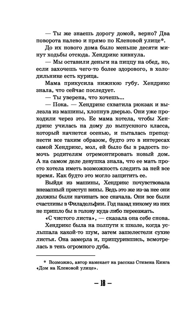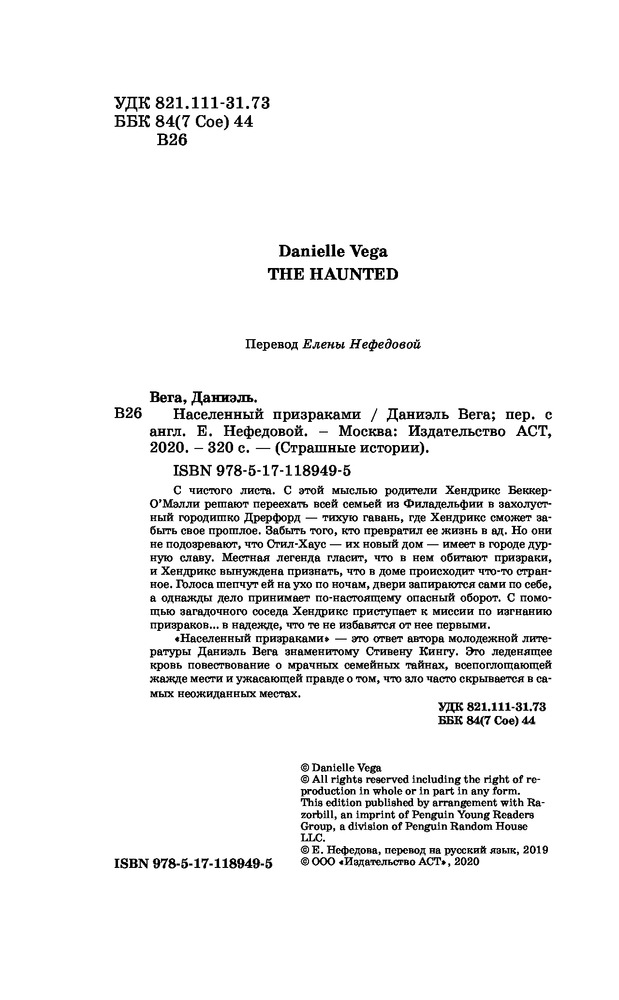 Серия: Страшные истории С чистого листа. С этой мыслью родители Хендрикс Беккер-О’Мэлли решают переехать всей семьей из Филадельфии в захолустный городишко Дрерфорд — тихую гавань, где Хендрикс сможет забыть свое прошлое. Забыть того, кто превратил ее жизнь в ад. Но они не подозревают, что Стил-Хаус — их новый дом — имеет в городе дурную славу. Местная легенда гласит, что в нем обитают призраки, и Хендрикс вынуждена признать, что в доме происходит что-то странное. Голоса шепчут ей на ухо по ночам, двери запираются сами по себе, а однажды дело принимает по-настоящему опасный оборот. С помощью загадочного соседа Хендрикс приступает к миссии по изгнанию призраков... в надежде, что те не избавятся от нее первыми. «Населенный призраками» — это ответ автора молодежной литературы Даниэль Вега знаменитому Стивену Кингу. Это леденящее кровь повествование о мрачных семейных тайнах, всепоглощающей жажде мести и ужасающей правде о том, что зло часто скрывается в самых неожиданных местах. |