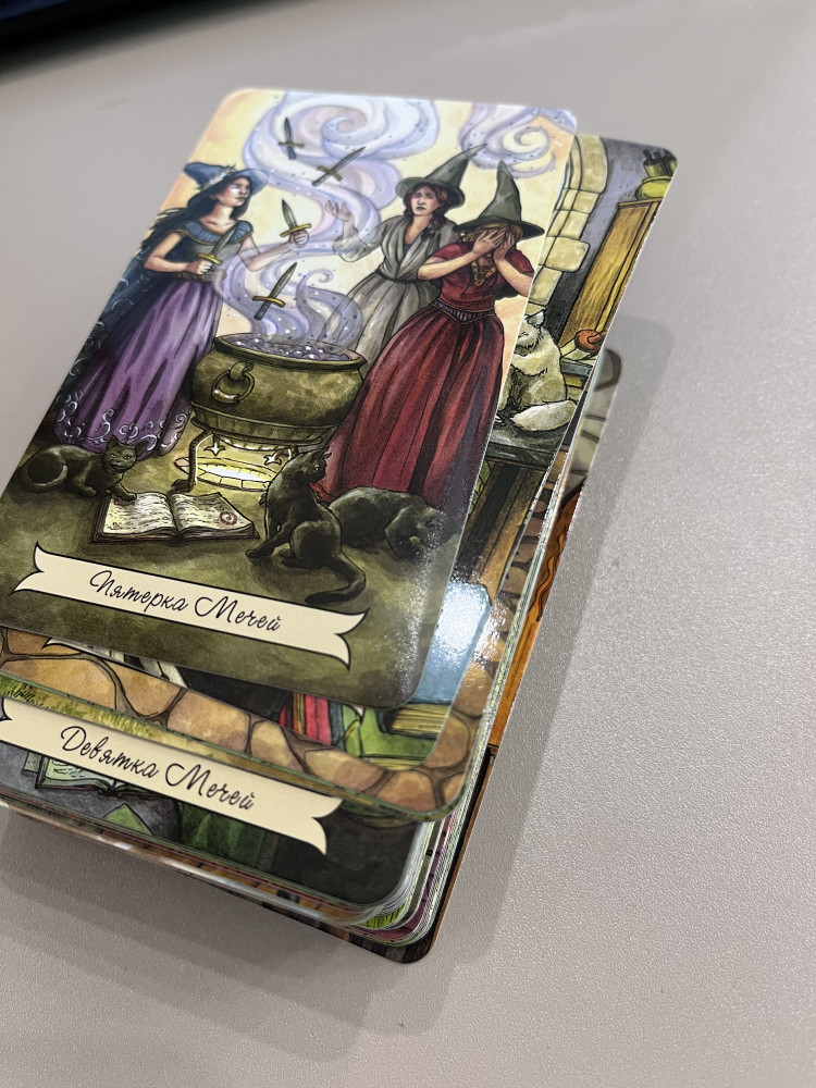 Очень красиво упакованы,коробка на магните. Особое удовольствие от этого! Энергетика тёплая чувствуется. Качество карт отличается от тех что у меня есть(золоченое, магия наслаждений, колесо года). Оно мне нравится меньше у этих карт,глянцевые, вырубка ощущается, но в руке удобно лежат. очень сильный запах краски. Думаю все таки выветрится и мы подружимся с этой колодой. Я очень довольна покупкой! спасибо!