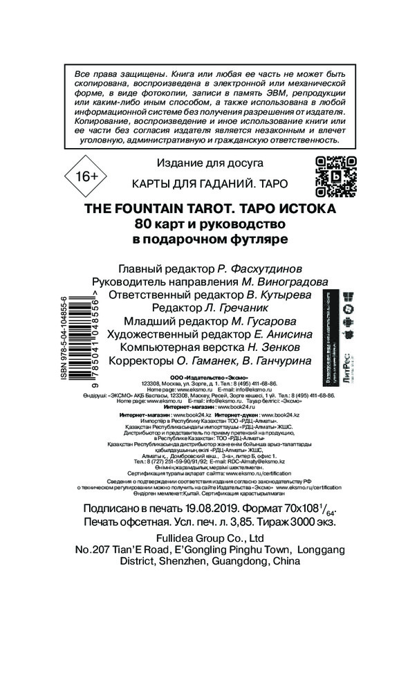 💳 Оплатить за товар можно при получении 🇰🇿 Есть бесплатная доставка по Казахстану от 1 дня 🎁 Копите бонусы с каждой покупки Серия: Карты для гаданий. Таро The Fountain Tarot, «Таро Истока», — смелое переосмысление традиционной системы Таро, сочетающее архетипы и символизм классики с духом и настроением современности. Художник Джонатан Сайз создал для этой колоды прозрачные воздушные образы, говорящие с самими глубинами подсознания, а дизайнер Энди Тодаро заключила карты в серебристый переливчатый футляр. Колоду сопровождает краткое, но емкое руководство Джейсона Грула, которое рассказывает, как читать карты и использовать их в качестве инструмента самопознания, поиска вдохновения и связи со своим внутренним Я. Как бы вы ни использовали эту колоду — вытягивали «карту дня» каждое утро, мгновенно активировали свою творческую энергию или искали в раскладе ответ на интересующий вас вопрос — The Fountain Tarot поможет вам пролить свет на свои самые глубинные стремления, максимально раскрыть свой потенциал и найти Исток, первопричину Всего. |
