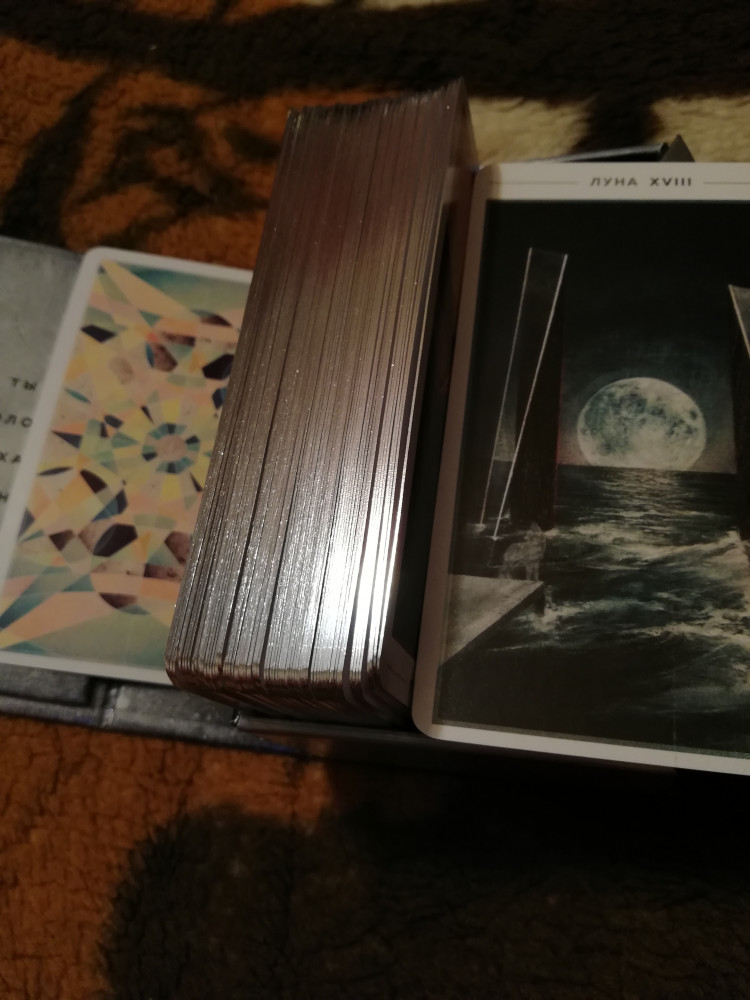Обалденная колода! Я долго сомневалась брать её или нет из-за отсутствия фото в магазина, но когда раскрыла упаковку - сразу пришла в неописуемый восторг и это с учётом, что она у меня уже далеко не первая. Удобная и долговечная коробка судя по ее жёсткости. Ровный серебристый срез и фантазийные образы.