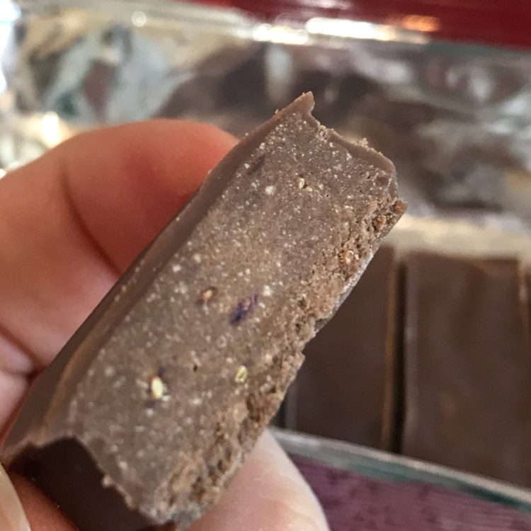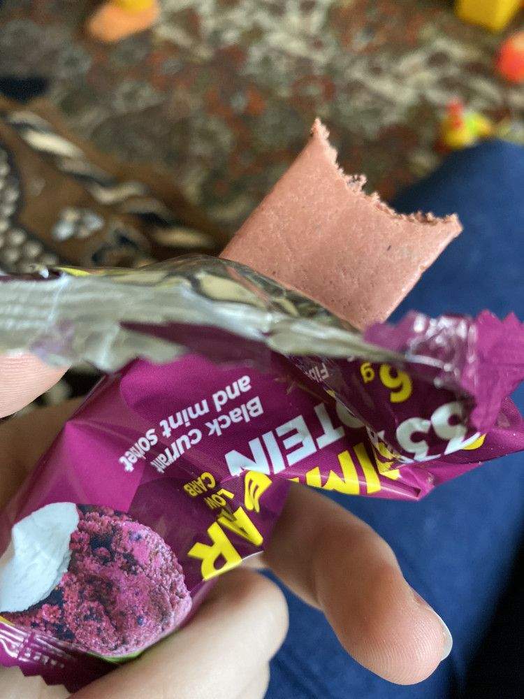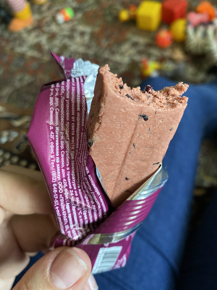 Мой первый протеиновый батончик. Химозно пахнет смородиной, на вкус есть мята. Не вкусно, но лучше, чем твикс.