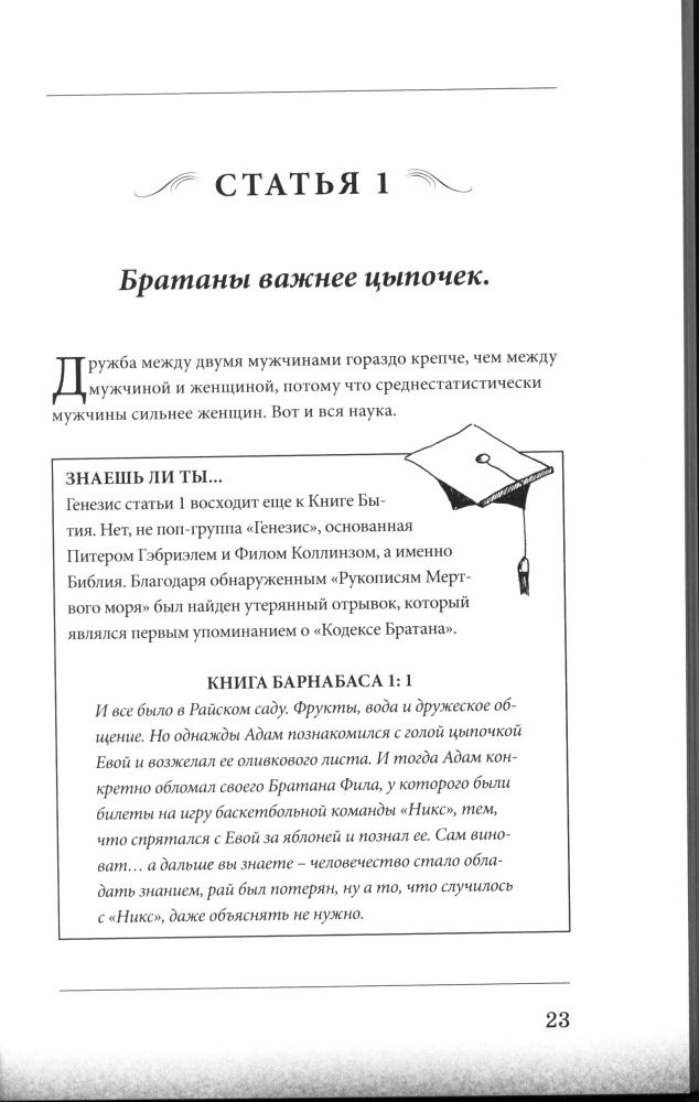 Кодекс БратанаВ данный момент этот товар отсутствует в продаже. Возможно, у нас найдется аналогичный или похожий товар здесь. «Кодекс Братана» — это настольная книга каждого уважающего себя мужчины. Испокон веков заповеди этой священной книги передавались из поколения в поколение, из уст в уста. В нем изложены не просто секреты настоящих мужчин и крепкой мужской дружбы, а представлен свод правил поведения, которые должен, нет — просто обязан соблюдать каждый Братан. Следуя правилам этого великого кодекса, любой парень может стать частью великого Братства. |