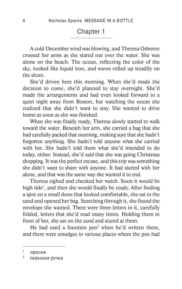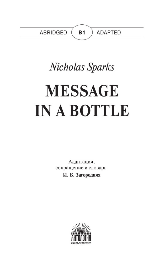 Message in a bottleВ данный момент этот товар отсутствует в продаже. Возможно, у нас найдется аналогичный или похожий товар здесь. Серия: Abridged&Adapted Незадолго до Рождества 1997 года на берег Атлантического океана в штате Северная Каролина выбросило бутылку с запечатанным в ней письмом. Автор послания никак не мог примириться с трагической гибелью своей жены и продолжал писать ей, отправляя в океан страницы, полные горестных мыслей. По воле случая письмо попало в руки преуспевающей журналистки и перевернуло всю её жизнь, соединив с человеком, о котором она мечтала. Однако её избранника преследуют воспоминания. Ему предстоит найти в себе силы расстаться с прошлым и вновь открыть своё сердце миру. |